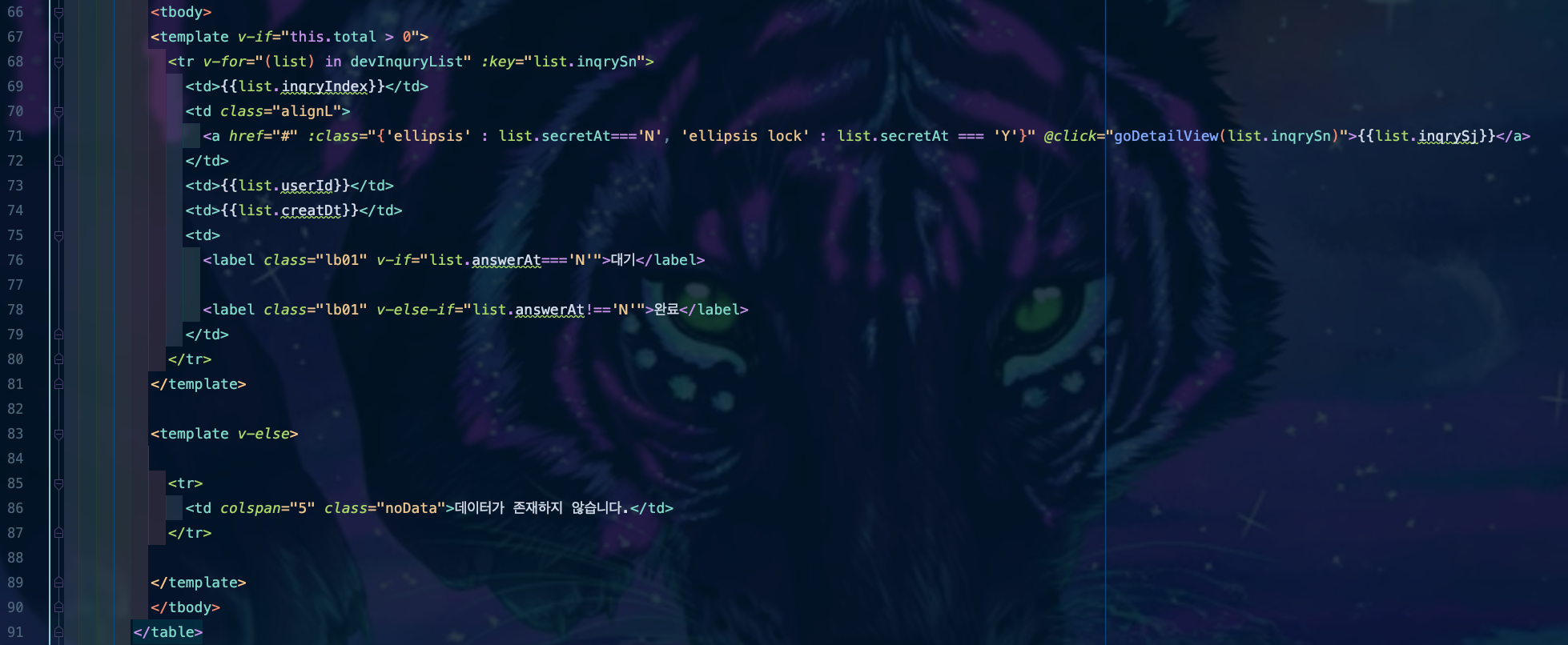 ๊ฒ์๊ธ ๋ชฉ๋ก ์กฐํ ์ฒ๋ฆฌ 83๋ฒ์งธ ์ค์ ๋ณด๋ฉด <templat>์ ํ๋ ๋ค์ ์์ํ๋๋ฐ ์ด๋ฒ์๋ v-else๊ฐ ๋ค์ด๊ฐ ๊ฒ์ด์์. ์์ v-if๋ฌธ ์กฐ๊ฑด์ ๋ง์ง ์์ผ๋ฉด ์ด๋ ๊ฒ ์ฒ๋ฆฌํด๋ผ! ๋ผ๊ณ ์ง์๋ฅผ ํ๋ ๊ฒ์ด์์.
