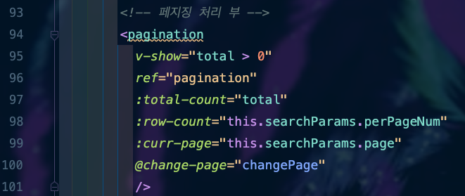 ๋จผ์ ํด๋น Tag๋ฅผ ๋ถ์ํด ๋ณด๋ฉด v-show๋ฅผ ํตํด ๊ฒ์๊ธ ๊ฐ์(total)์ด 0๋ณด๋ค ํฌ๋ค๋ฉด ๋ณด์ฌ์ฃผ๊ณ , ๊ทธ๋ ์ง ์์ผ๋ฉด ๋ณด์ด์ง ์๊ฒ ๋ค๋ ๊ฒ์ด๊ณ , ref ์์ฑ์ผ๋ก pagination Coponent ์ด๋ฆ์ ์ฐธ์กฐํ๊ฒ ๋ค๋ ๊ฒ์ธ๋ฐ, ๊ทธ๋ผ ์ด Component๋ ์ด๋์ ์ ์ธ์ด ๋์ด ์์๊น์?