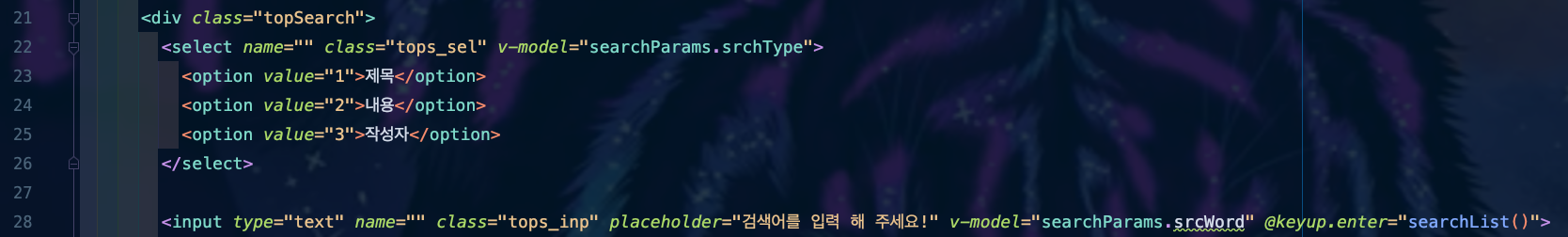 ์ต์ด ๊ฒ์์ ๋ํ Type์ ์ก์ ์ฃผ๊ธฐ ์ํด select Box๋ฅผ ํ๋ ์ก์ ์ค ๊ฒ์ด์์. ๊ฒ์ Type์ด๋ '์ ๋ชฉ', '๋ด์ฉ', '์์ฑ์' ๋ฑ์ ํตํด ํด๋น ๋ด์ฉ์ ๊ฒ์ํ ์ ์๋ ๊ฒ์ด์์. select Box์ option Tag๋ก ์ ๋ชฉ, ๋ด์ฉ, ์์ฑ์๋ฅผ ์กฐํํ ์ ์๋ ๋ถ๋ถ์ ๋ง๋ค์๊ณ , ํด๋น Tag์ value๋ ์ซ์๋ฅผ ๋ฃ์ด์ค ๊ฒ์ด์์.