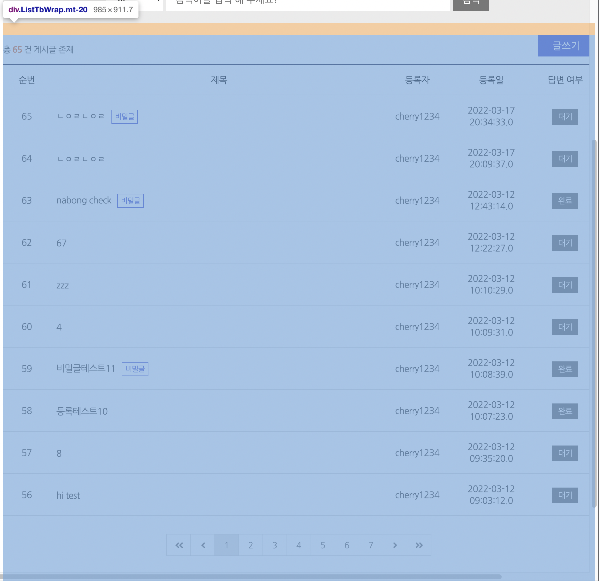 ์ด์ ๋ณธ๊ฒฉ์ ์ผ๋ก ๊ฒ์๊ธ์ ๋ํ ๋ชฉ๋ก ์ฒ๋ฆฌ, ํ์ด์ง ์ฒ๋ฆฌ๋ฅผ ํ๋ ๋ถ๋ถ์ ๋ํด ๊ตฌ์ญ์ ์ค์ ํ๊ธฐ ์ํด <div class "ListbWrap mt-20">์ผ๋ก ๋ฌถ์ด์ค ๊ฒ์ด์์.