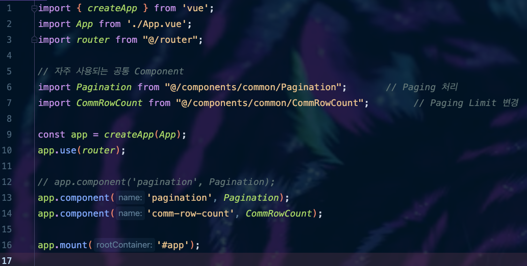 ๊ทธ๊ฑด ๋ฐ๋ก ์ ์ญ์ ์ฒ๋ฆฌ๋ฅผ ํ ์ ์๋ main.js์ ์๋ ๊ฒ์ด์์. ์ฌ๊ธฐ 6๋ฒ์งธ ์ค์ ๋ณด๋ฉด Pagination.vue๋ฅผ Pagination์ด๋ ์ด๋ฆ์ผ๋ก Import๋ฅผ ํ๊ณ , app์ ํตํด component๋ฅผ ๋ง๋๋๋ฐ, ์ด๋ฆ์ paginateion์ผ๋ก ๋ง๋ค๊ณ , ๊ทธ Component์ ๊ฐ์ ์ ๋ ฅํด ์ฒ๋ฆฌ๊ฐ ๋๋๋ก ํ ๊ฒ์ด์์.