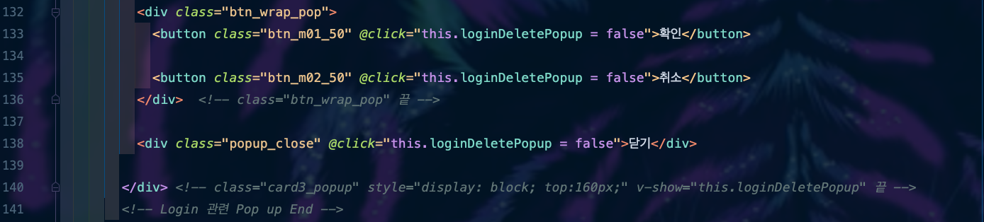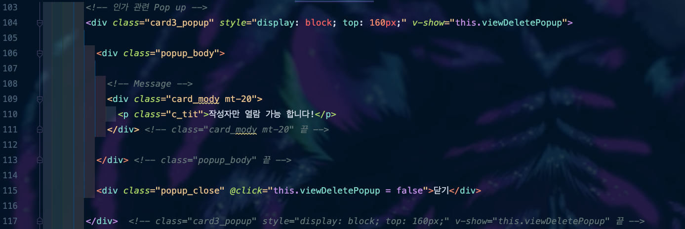 ์ด์ Pop up์ฐฝ์ ๋ํด์ ํ๋ฒ ๋ง๋ค์ด ๋ณด๋ ค๊ณ ํ๋ ๊ฒ์ด์์. ๋จผ์ ์ธ๊ฐ ๊ด๋ จ Pop up์ ๋ง๋ค๊ฑด๋ฐ, ์์ ์ฝ๋์์ 104๋ฒ์งธ ์ค์ v-show ์์ฑ์ด ์๋ ๊ฒ์ด์์. ์กฐ๊ฑด์ ๋ง์ผ๋ฉด ๋ณด์ฌ์ฃผ๊ณ , ๋ง์ง ์์ผ๋ฉด ๋ณด์ฌ์ฃผ์ง ์๊ฒ ๋ค๋ ๊ฒ์ด์์.