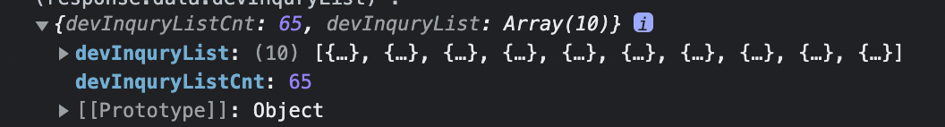 ๊ทธ ์์๋ ์ด๋ ๊ฒ devInquryList๋ผ๋ ๋ฐฐ์ด๋ก ์ด๋ค์ง ๊ฐ์ฒด๋ค ๊ฐ๊ณผ ํด๋น ๊ฒ์ํ์ ์กฐํ๋ ๊ฒ์๊ธ ๊ฐ์์ธ devInquryListCnt๊ฐ ๊ฐ์ฒด ํ์(Key : Value)๋ก ๋ค์ด ์๋ ๊ฒ์ด์์.