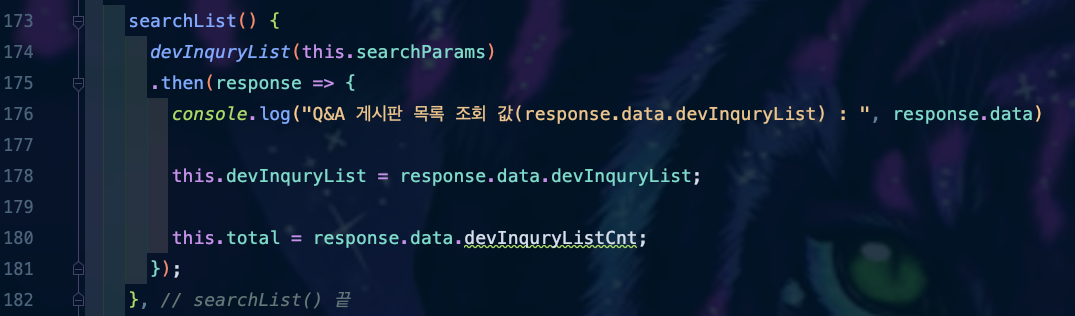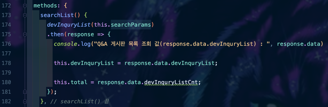 ๊ทธ๋ฐ ๋ค ์ฃผ๋ํ๋์ ๋ค์ด์จ Data๋ฅผ ์๋ฆฌ์กฐ๋ฆฌ ์ด์ฉํ๊ธฐ ์ํด data()์ ์ ์ํ devInquryList๋ผ๋ ๋ฐฐ์ด์ ์๋ต์ผ๋ก ๋ค์ด์จ devInquryList๋ฅผ ๋ฃ์ด์ฃผ๊ณ , total์ด๋ผ๋ ๋ณ์์ devInquryListCnt ๊ฐ์ ๋ฃ์ด์ค ๊ฒ์ด์์.