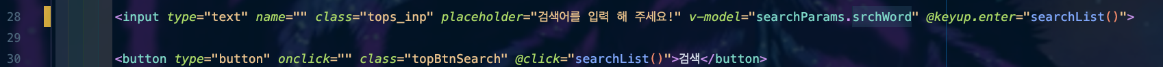 v-model์ ์ค์ ํด ์ค ๊ฒ์ฒ๋ผ searchParams๋ผ๋ ๊ฐ์ฒด(Object)์์ srchWord ๊ฐ์ฒด ์ด๋ฆ๊ณผ ๊ฐ์ ์ด๊ธฐํํด์ ์ ์ ํด ์ค ๊ฒ์ด์์.