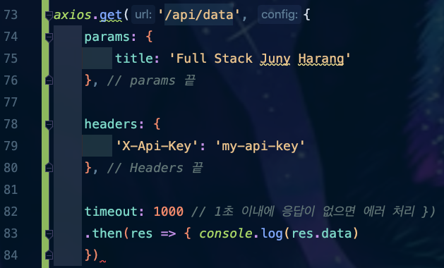 ๋ํ, Axios ์์ฒญ ์์ ๋งค๊ฐ ๋ณ์ ์ ๋ณด๊ฐ ์๋๋ผ Method์ ๋๋ฒ์งธ ์ธ์์ธ config ๊ฐ์ฒด๋ก ์์ฒญ์ ํ ์๋ ์๋ ๊ฒ์ด์์.