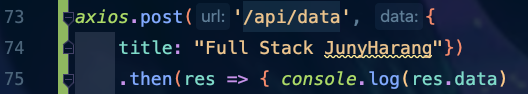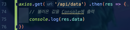 ์ ์ฝ๋๋ฅผ ๋ถ์ํด ๋ณด๋ฉด /api/data ๋ผ๋ BackEnd์์ ๊ตฌ์ฑ๋ URI๋ฅผ ํตํด Data์ ๋ํ Request๋ฅผ ๋ณด๋ด Data๋ฅผ ๋ฌ๋ผ๊ณ ํ๋ ๊ฒ์ด์์. ๋ถ๋ฌ์จ Data๋ `.then()`์ res๋ผ๋ ๊ณณ์ ๋ด์ ์ฒ๋ฆฌํ๋ ๋ฐฉ์์ด๋๋๋ค.