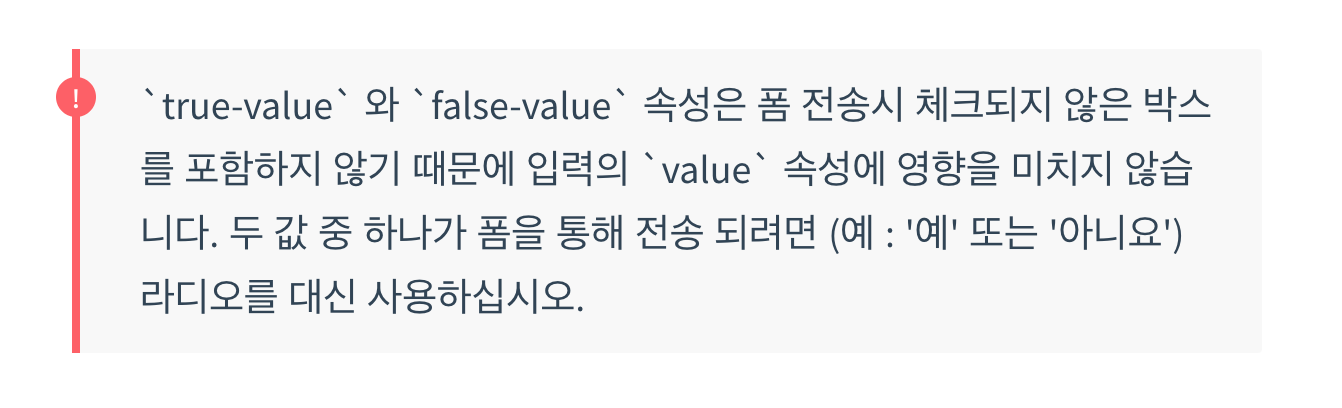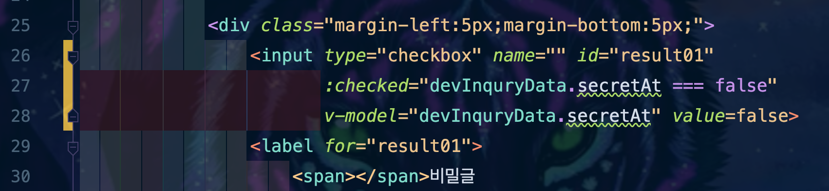 ํ์ง๋ง, ์์ Code๋ฅผ ๋ณด๋ฉด secretAt์ false๊ฐ์ด ๋ค์ด๊ฐ๋๋ก :checked ์์ฑ์๋ ๋ฃ์ด์ฃผ๊ณ , v-model์๋ ๋ฃ์ด์ค์ Data๋ฅผ Bindding ํด ์ฃผ์์ง๋ง, ๋ฌธ์ ๋ ํด๊ฒฐ ๋์ง ์์ ๊ฒ์ด์์.