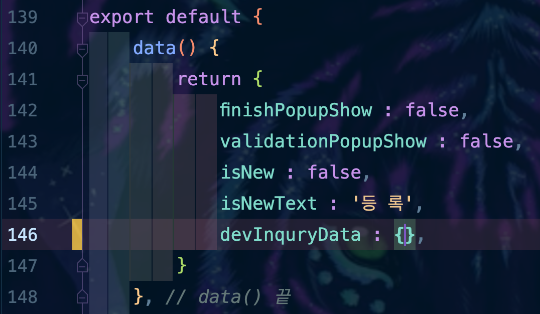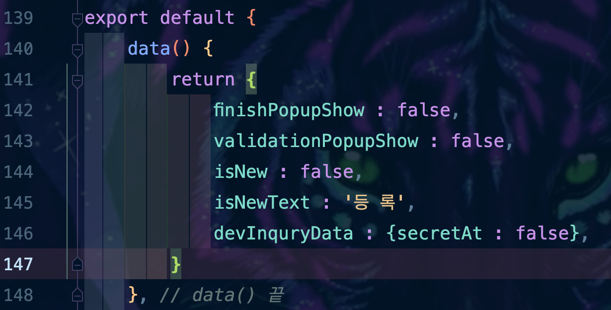 146๋ฒ์งธ ์ค์ ๋ณด๋ฉด devInquryData ๊ฐ์ฒด(Object)์ secretAt์ด๋ฆ์ ๊ฐ์ง ๊ฐ์ฒด์ ์ด๊ธฐํ ๊ฐ์ `false`๋ก ๋ฃ์ด์ค ๊ฒ์ด์์.