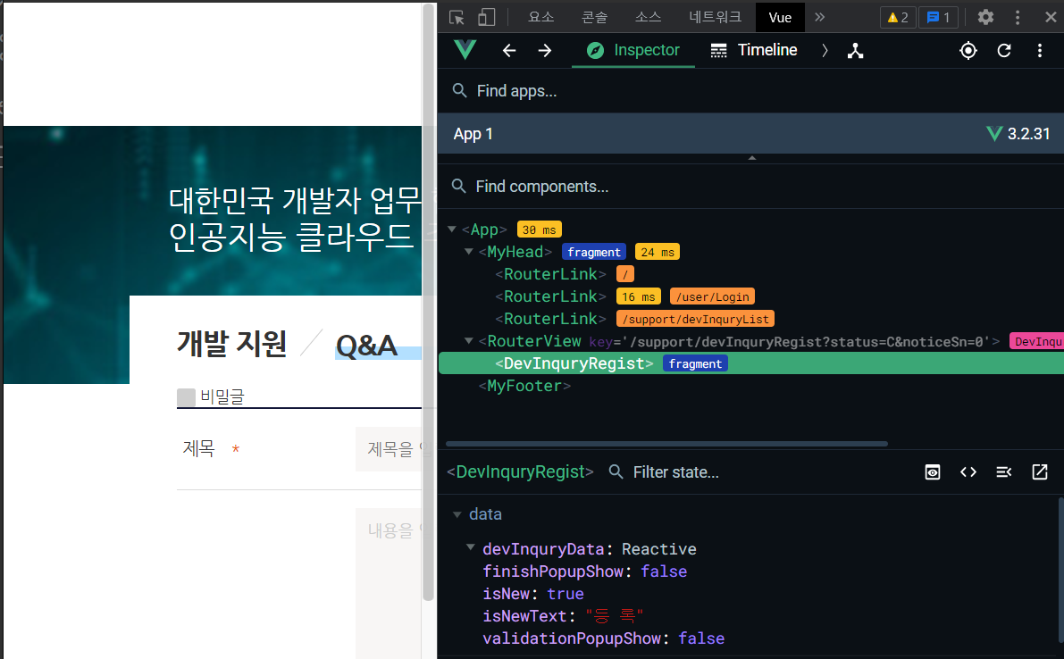 ์ฐ์ธก์ vue ๊ฐ๋ฐ์ ๋ชจ๋๋ฅผ ๋ณด๋ฉด devInquryData์ seceatAt์ ๋ํ ๋ด์ฉ์ด ๋ณด์ด์ง ์๋ ๊ฒ์ด์์.