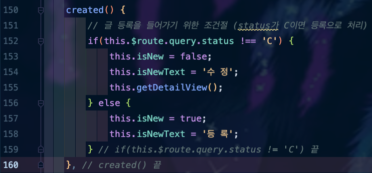 ์ฌ๊ธฐ created()๋ฅผ ๋ณด๊ฒ ๋๋ฉด ํด๋น Component๊ฐ Rendering๋ ๋, ์ด Method๊ฐ ๋์ํ๊ฒ ๋๋๋ฐ, ์ต์ด router์์ ์ ๋ฌ๋ query๋ผ๋ ๊ฐ์ฒด ์์ status์ ๊ฐ์ ํ์ธ ํ๋ ๊ฒ์ด์์.