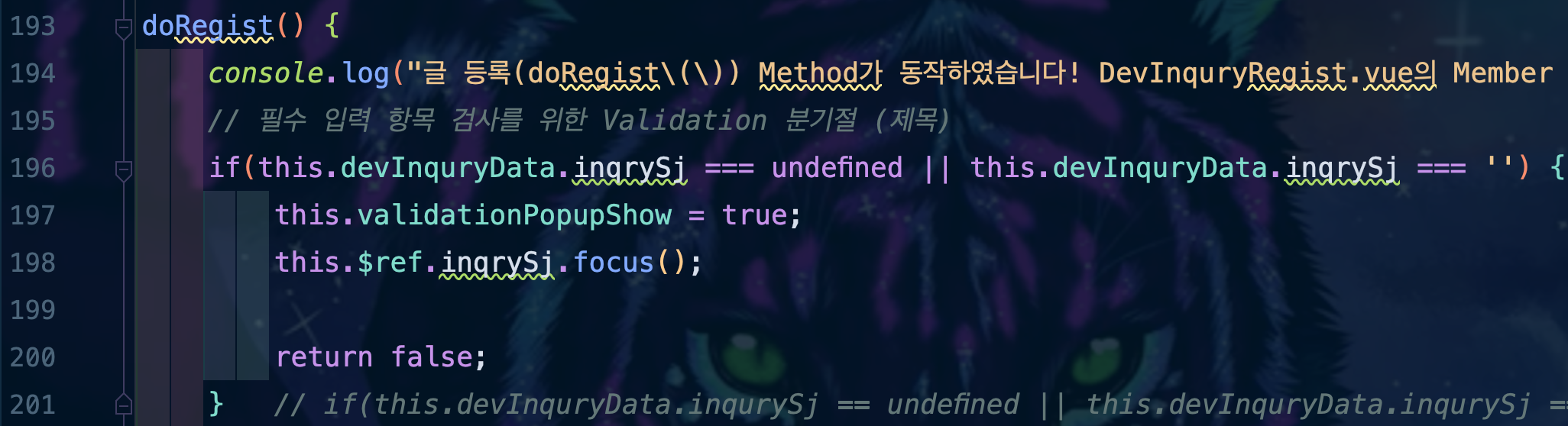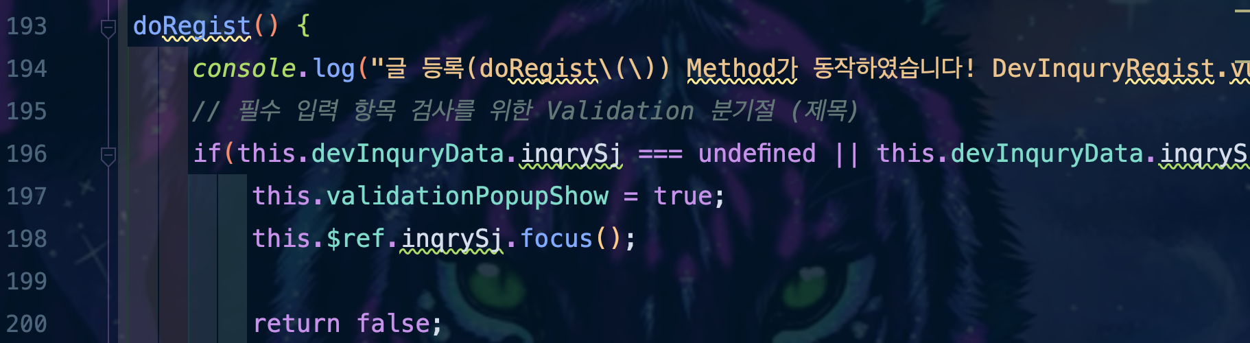 ์ด Method๊ฐ ํธ์ถ๋๋ฉด ํด๋น Method๊ฐ ๋์ํ๋ค๋ ๊ฒ์ ์๋ ค์ฃผ๊ธฐ ์ํ console ์ถ๋ ฅ์ด ๋ฐ์ํ๊ณ , ๊ฒ์๊ธ ์ ๋ชฉ(inqrySj)๊ฐ ๋น์ด์๊ฑฐ๋, null์ธ์ง๋ฅผ ํ๋จํด์ ๊ทธ๊ฒ ๋ง๋ค๋ฉด `validationPopupShow`๋ฅผ true ๊ฐ์ผ๋ก ๋ฐ๊ฟ ์ฃผ๋ ๊ฒ์ด์์.