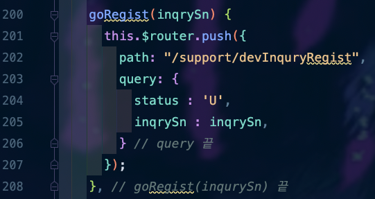 ์ด ์น๊ตฌ๊ฐ ํธ์ถ๋๊ฒ ๋๋ฉด ๋จผ์ Router๋ฅผ ํตํด DevInquryRegist Component๋ฅผ Re Renderingํ๊ฒ ๋๊ณ , '๋ฑ๋ก'๊ณผ๋ ๋ค๋ฅด๊ฒ status์ ๊ฐ์ 'U'๋ก ์ฃผ์ด ๊ธ ์์ Logic์ด ์ํ๋๋๋ก ๋ง๋ค์ด ์ค ๊ฒ์ด์์.