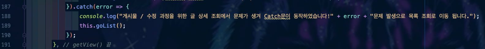 ๋ง์ฝ ์ ๊ทธ๋ฆผ `DevInquryRegist.vue - getDetailView()`์์ ๋ฌธ์ ๊ฐ ์๊ฒจ catch ๋ฌธ์ผ๋ก ์ง์ ํ๊ฒ ๋๋ฉด ์ด๋ป๊ฒ ๋ ๊น์?