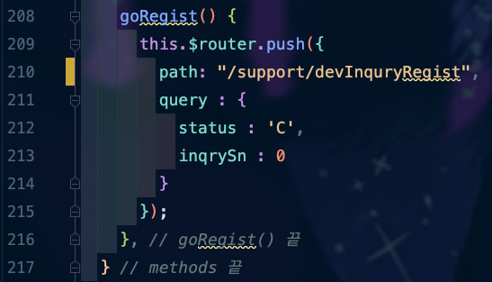 ์์๋ '๊ธ ๋ฑ๋ก' Logic์ ์ฒ๋ฆฌํ๊ธฐ ์ํ Method์ธ๋ฐ, ๋งค๊ฐ ๋ณ์๊ฐ ์๋ ํํ๋ก ํธ์ถ์ด ๋๊ฒ ์์ฑ์ด ๋์ด ์๊ณ , ํด๋น Method๊ฐ ํธ์ถ์ด ๋๋ฉด DevInquryRegist Component๋ฅผ Re Renderingํ๊ฒ ๋์ด ์๋๋ฐ, query๋ฅผ ์ด์ฉํ์ฌ status๋ฅผ 'C'๋ก ์ฃผ์ด '๋ฑ๋ก'์ด๋ผ๋ Logic์ด ์ฒ๋ฆฌ๋๊ฒ ํด ์ฃผ๋ ๊ฒ์ด์์.