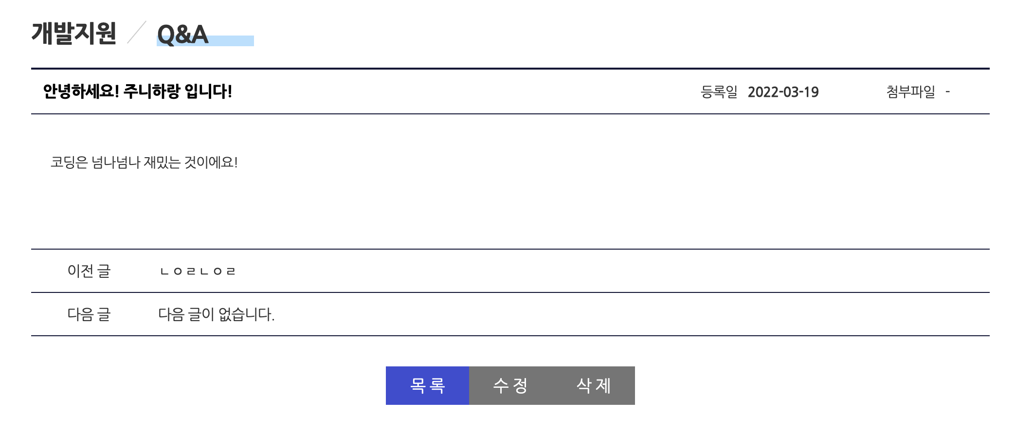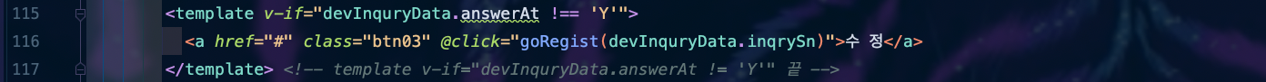 ์ Button์ ๋ต๊ธ์ด ์์ด์ผ์ง ๋ณด์ฌ์ง๊ฒ ๋๋๋ฐ, ๊ทธ ์ด์ ๋ 115๋ฒ์งธ ์ค์์ template Tag์์ v-if๋ฅผ ํตํด ๋ต๋ณ ์ฌ๋ถ(answerAt)์ด 'Y'๊ฐ ์๋๋ผ๋ฉด ์ฆ, 'N'์ด๋ผ๋ฉด Rendering ํด๋ผ! ๋ผ๊ณ ํด์ค ๊ฒ์ด์์.