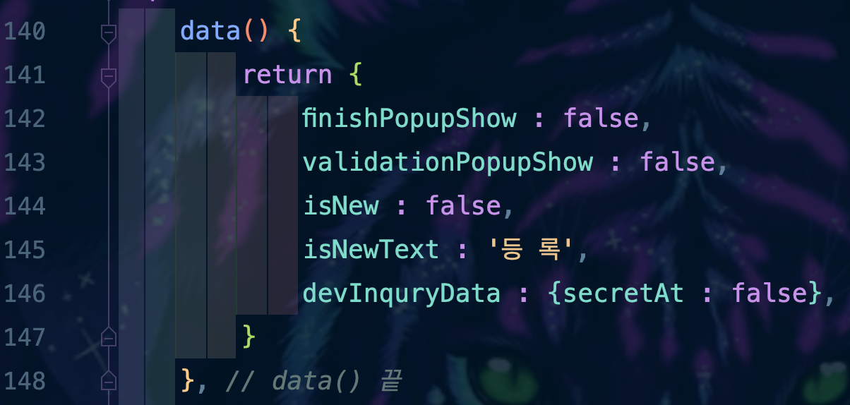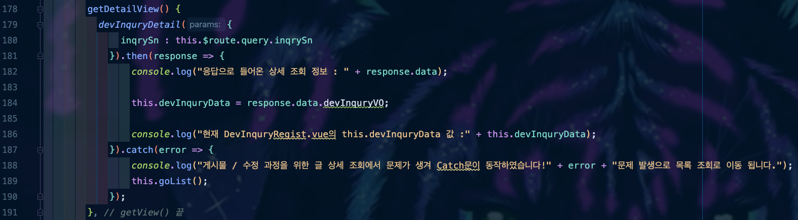 ๋ค์ `DevInquryRegist.vue - getDetailView()`๋ก ๋์์ ๋ณด๋ฉด BackEnd์์ ํต์ ์ ๋ ๋ง์น๊ณ , BackEnd๋ ๊ฒ์๊ธ ์ผ๋ จ๋ฒํธ๋ก ์กฐํ๋ฅผ ์์ฒญํ๋ ๊ฒ์๊ธ ์ ๋ณด๋ฅผ ์ ๋ฌ์ ํด ์ค๊ฒ์ด์์. ๊ทธ ๋ด์ฉ์ด 173๋ฒ์งธ ์ค response์ ๋ด๊ธฐ๊ฒ ๋๊ณ , 176๋ฒ์งธ ์ค์ BackEnd๊ฐ ์ ๋ฌํด ์ค ๊ฒ์๊ธ์ ๋ชจ๋ ์ ๋ณด๋ฅผ `devInquryData`๋ผ๋ ๊ฐ์ฒด(Object)์ ์ ์ฅ์ ํด ์ค ๊ฒ์ด์์.