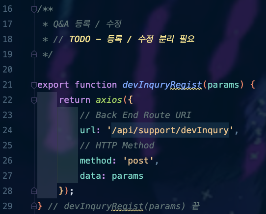 ์ต์ด ์ด Method๊ฐ ํธ์ถ๋๋ฉด devInquryDetail์ ํธ์ถํ๋๋ฐ, ์ด Method๋ API๋ก Axios๋ฅผ ํตํด Back End์ ํต์ ์ ์ํด ์ ์ํ Method์ธ ๊ฒ์ด์์. devInquryDetail์ ํธ์ถ ํ ๋, 212๋ฒ์งธ ์ค์ ๋ณด๋ฉด ๊ฒ์๊ธ ์ผ๋ จ๋ฒํธ๋ฅผ ์์ธ ์กฐํ ๋ ๊ฐ์ง๊ณ ์๋ ๊ฒ์ ๋๊ฒจ ์ฃผ๋ ๊ฒ์ ๋ณผ ์ ์๋ ๊ฒ์ด์์.