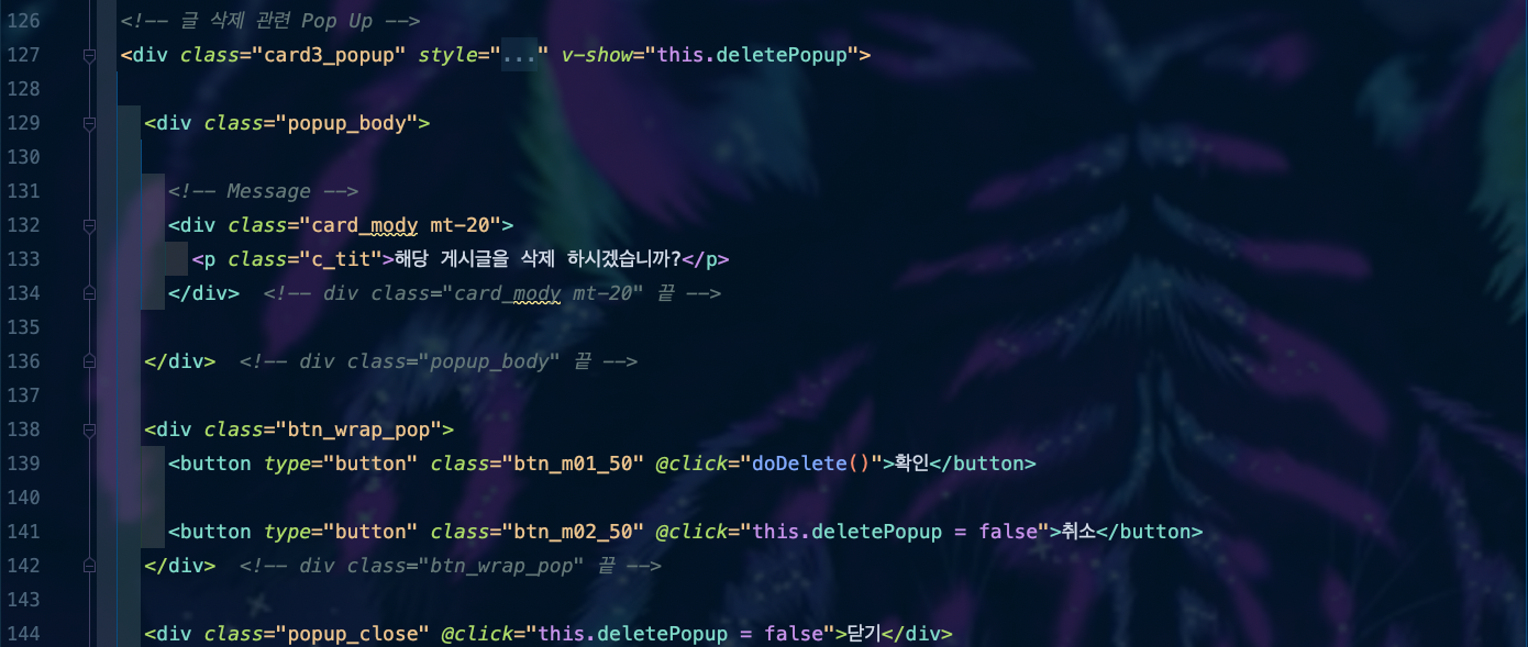 127๋ฒ์งธ ์ค์ ๋ณด๊ฒ ๋๋ฉด v-show๋ฅผ ํตํด deletePopup ๋ณ์๊ฐ `true`๋ผ๋ฉด Pop up ํ๋ฉด์ ๋ณด์ฌ์ฃผ๊ฒ ์ฒ๋ฆฌ๊ฐ ๋ ๊ฒ์ด์์.