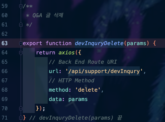 devInquryDelete๊ฐ ํธ์ถ์ด ๋๋ฉด ์ด ๊ณณ์ ์ค๊ฒ ๋๋๋ฐ, Back End Controller์ ์ง์ ๋ URI์ HTTP Method `delete`๋ฅผ ํตํด ๋งค๊ฐ ๋ณ์๋ก ๋ค์ด์จ ๊ฒ์๊ธ ์ผ๋ จ๋ฒํธ(inqurySn)์ ๊ฐ์ด ์ ๋ฌ ํด ์ฃผ๋ ๊ฒ์ด์์.