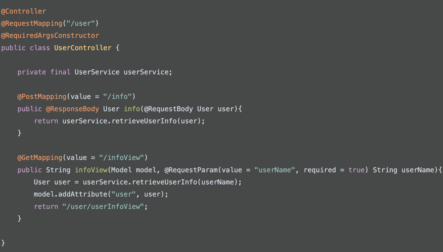 ์์ ๊ฐ์ ์์ ์์ info๋ผ๋ Data๋ฅผ ๋ฐํํ๊ณ ์ ํ๊ณ ์๊ณ , User๋ฅผ JSON์ผ๋ก ๋ณํํ๊ธฐ ์ํด @ResponseBody๋ผ๋ Annotation์ ๋ถ์ฌ์ฃผ๊ณ ์๋ ๊ฒ์ด์์. infoView Method์์๋ View๋ฅผ ์ ๋จํด์ฃผ๊ณ ์๊ธฐ ๋๋ฌธ์ String์ ๋ฐํ๊ฐ์ผ๋ก ์ค์ ํด ์ค ๊ฒ์ด๋๋๋ค. (Data๋ฅผ ๋ฐํํ๋ RestController์ View๋ฅผ ๋ฐํํ๋ Controller๋ฅผ ๋ถ๋ฆฌํด์ ์ด์ฉํ๋ ๊ฒ์ด ์ข๋ค.)