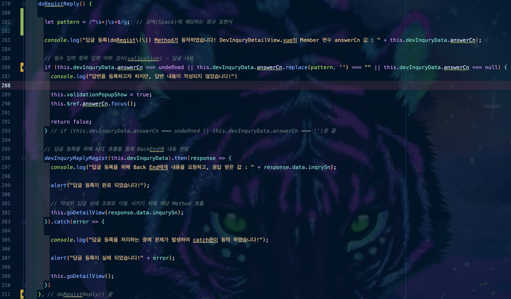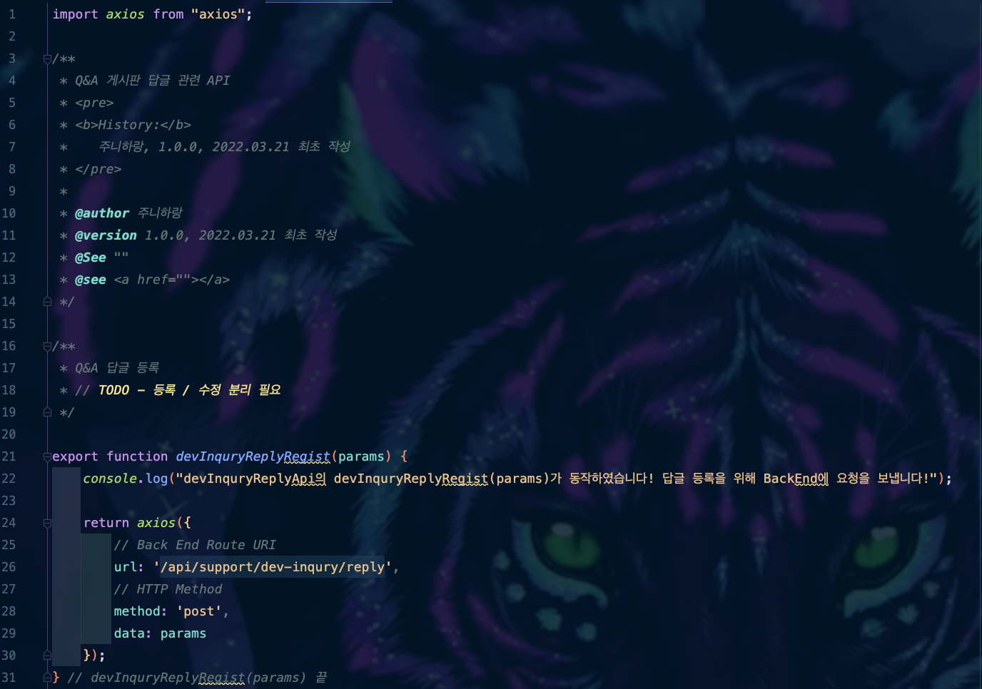 ๋จผ์ ์ด Method๊ฐ ๋์ํ๋ฉด Cosole์ ๋ด์ฉ์ ์ถ๋ ฅํ ๋ค Server (Back End - API)์ ์์ฒญ์ ๋ณด๋ด๊ฒ ๋๋๋ฐ, ํด๋น URI์ HTTP Method๋ฅผ `post`๋ก ํ์ฌ Request Body์ ๋ต๊ธ์ ์ ๋ ฅํ๊ธฐ ์ํด ํ์ํ ๋ต๋ณ ์ฌ๋ถ(answerAt), ๋ต๋ณ ๋ด์ฉ(answerCn), ๋ต๊ธ ์์ฑ์ ์ผ๋ จ๋ฒํธ(answerUserSn), ๊ฒ์๊ธ ์ผ๋ จ ๋ฒํธ(inqurySn)์ ๋ํ ๊ฐ์ ๋ด์ data๋ก ๋ณด๋ด์ฃผ๋ ๊ฒ์ด์์.