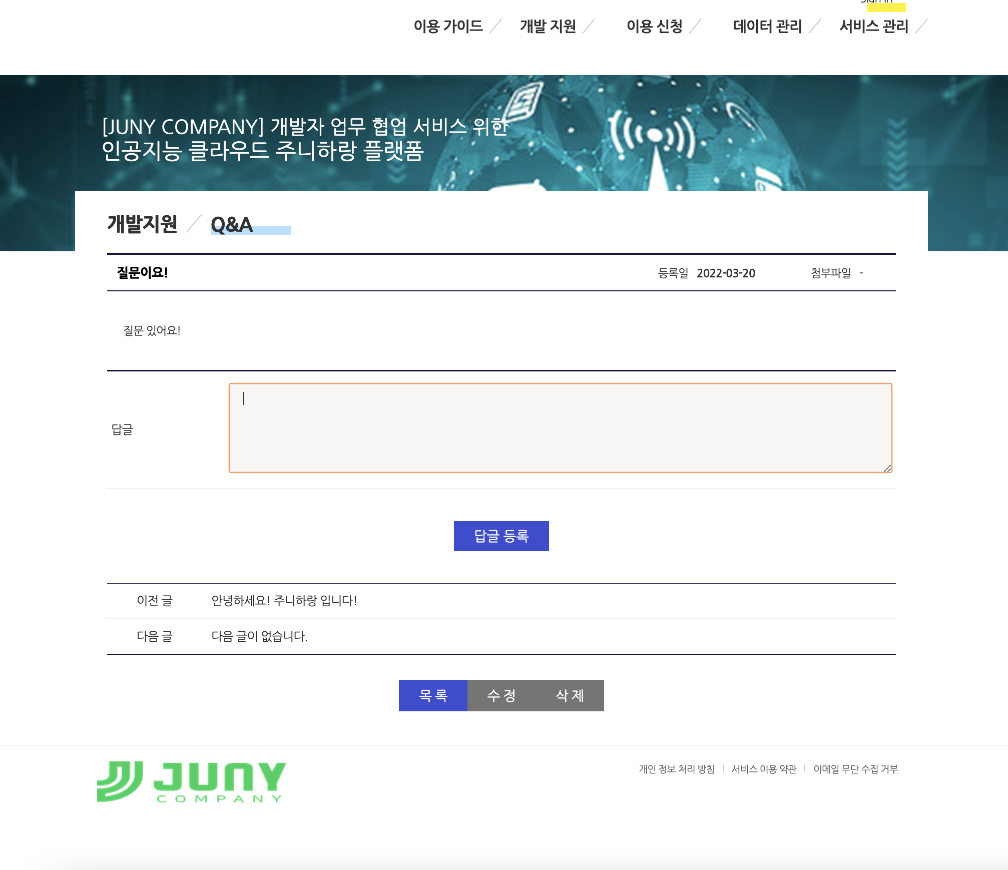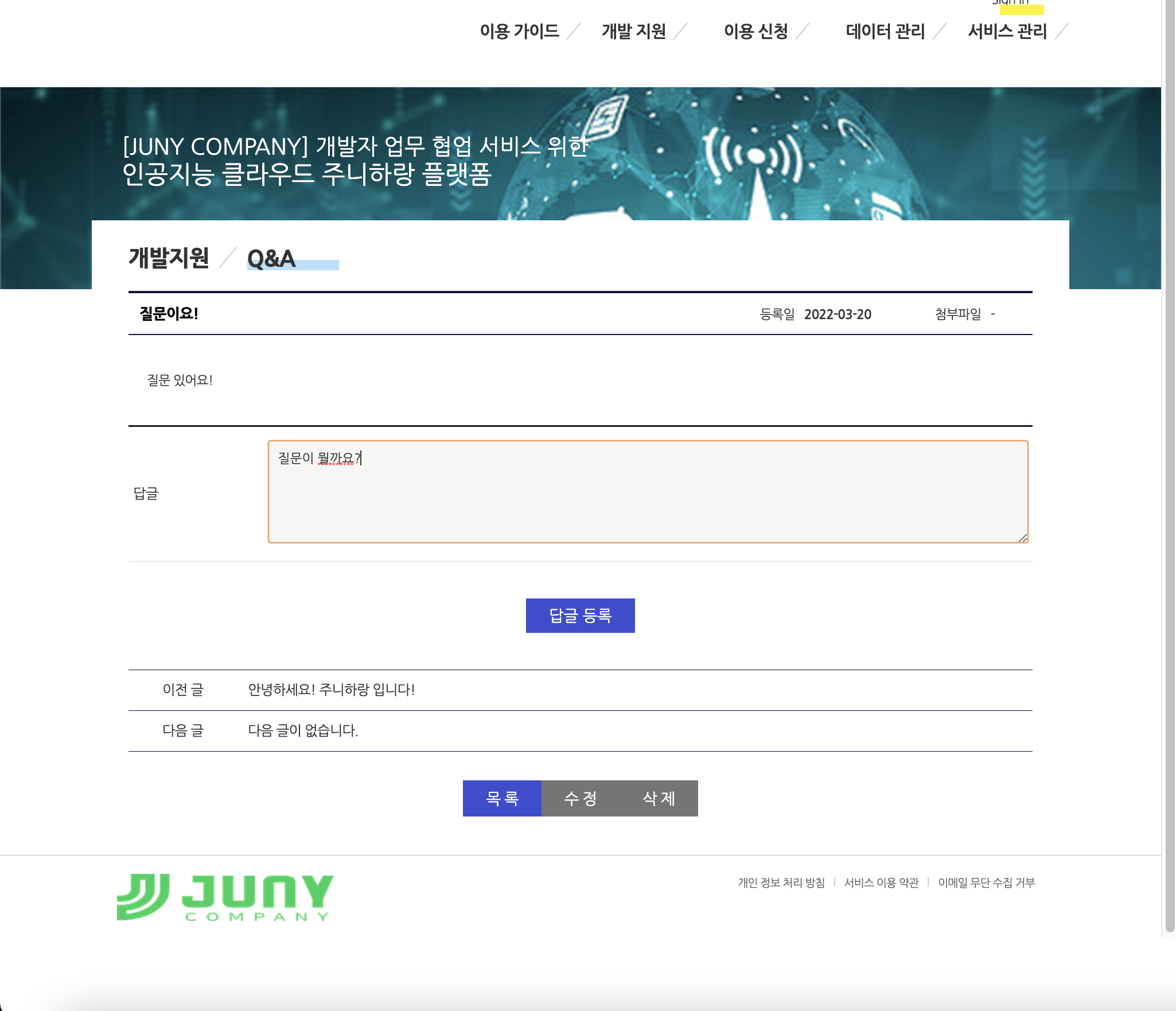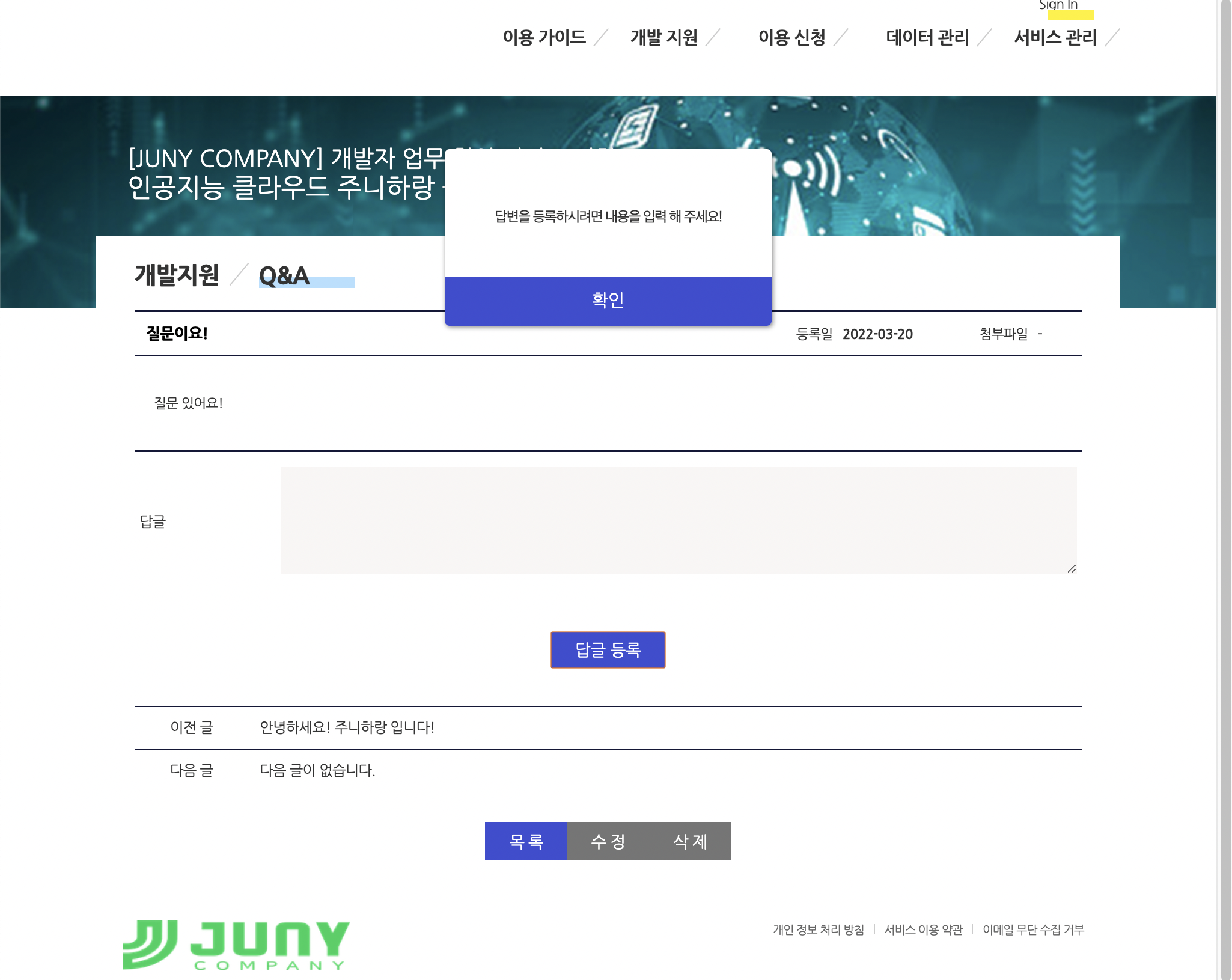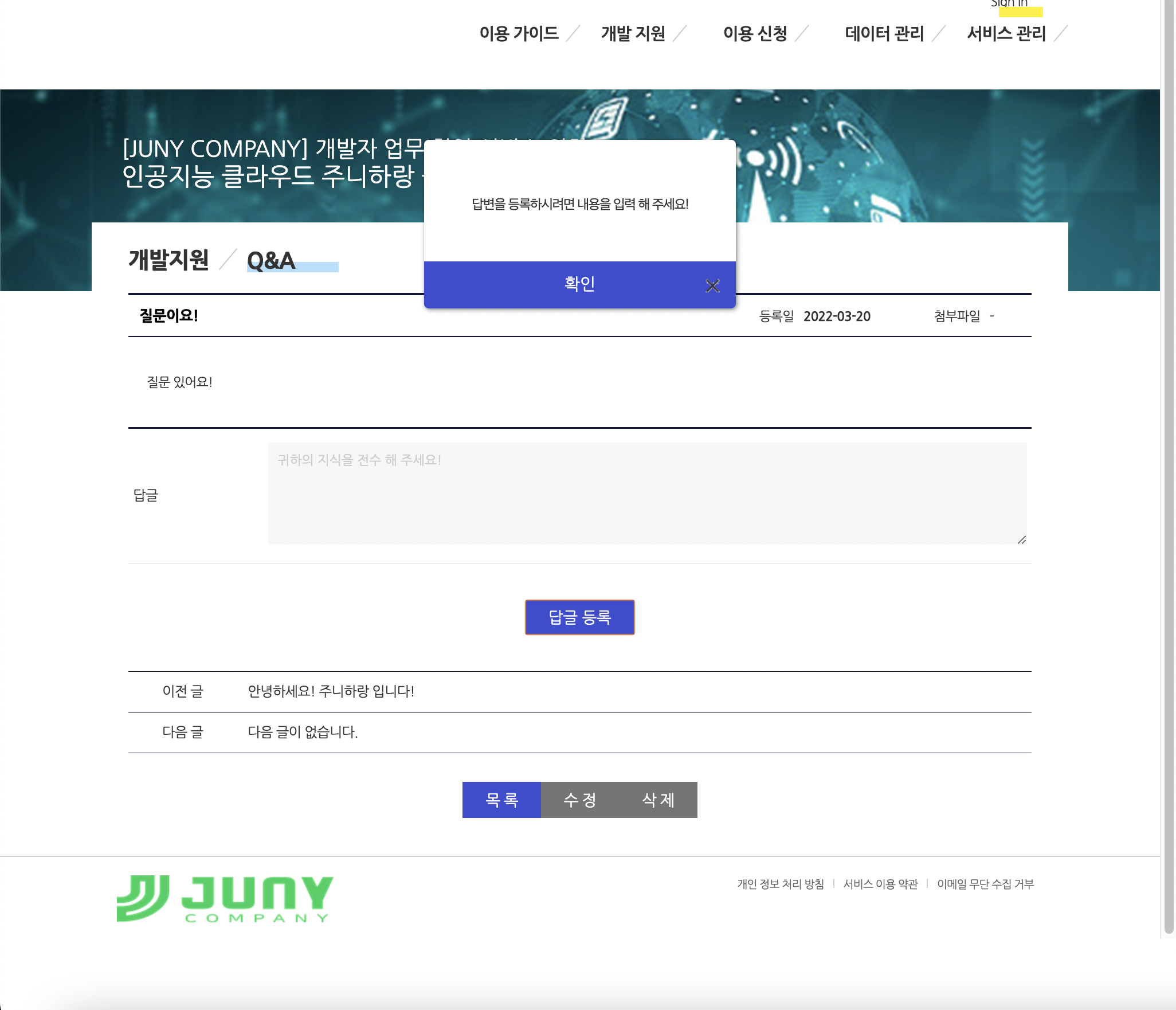 ๋ต๊ธ ์์ ์ '๋ต๊ธ ์์ '์ด๋ผ๋ Button์ Click ํจ์ผ๋ก Click Event๋ฅผ ํตํด devInquryData ์์ answerAt์ด "N"์ผ๋ก ๋ฐ๊พธ๋ฉด์ ๋ถํฐ ์์ํ๋ ๊ฒ์ด์์.