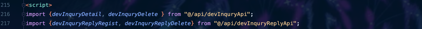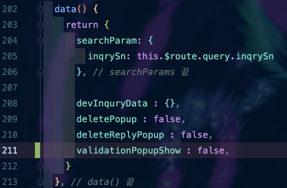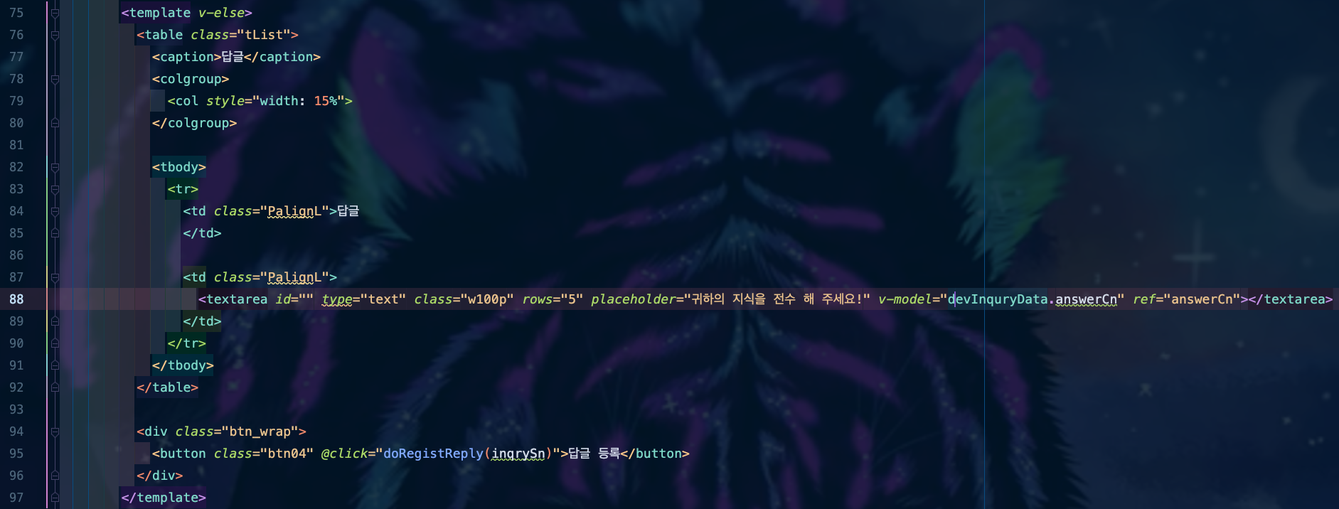 ์ฌ๊ธฐ์ ํ๊ฐ์ง ์ง๊ณ ๋์ด๊ฐ์ผ ํ ๊ฒ์ <templat> Tag๋ฅผ ๋ณด์๋ฉด v-if๋ฌธ์ด ์๊ณ , devInquryData ์์ answerAt ๋ณ์์ ๊ฐ์ด 'N'์ด ์๋๋ผ๋ฉด ์ฆ, 'Y'๋ผ๋ฉด ๋ต๋ณ ๋ด์ฉ์ ํ์ํ๋ผ๊ณ ํ ๊ฒ์ด์์.