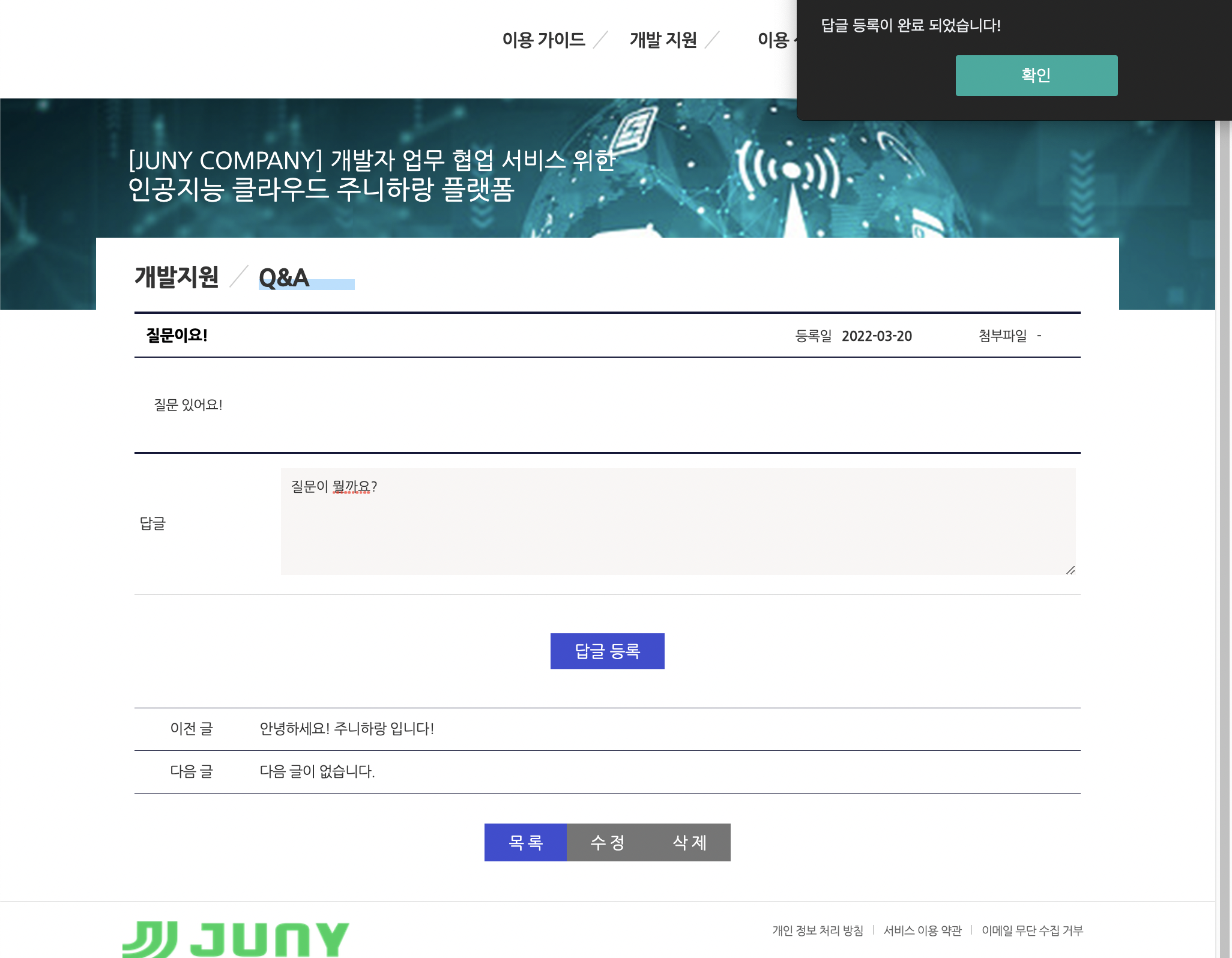 ๋จผ์ ๋ชฉ๋ก ์กฐํ ํ๋ฉด์์ ๋ณด๋ฉด ์๋์ ๊ฐ์ด `๋ต๋ณ ์ฌ๋ถ`์ `๋๊ธฐ`์ `์๋ฃ`๊ฐ ์๋ ๊ฒ์ ํ์ธํ ์ ์๋ ๊ฒ์ด์์.