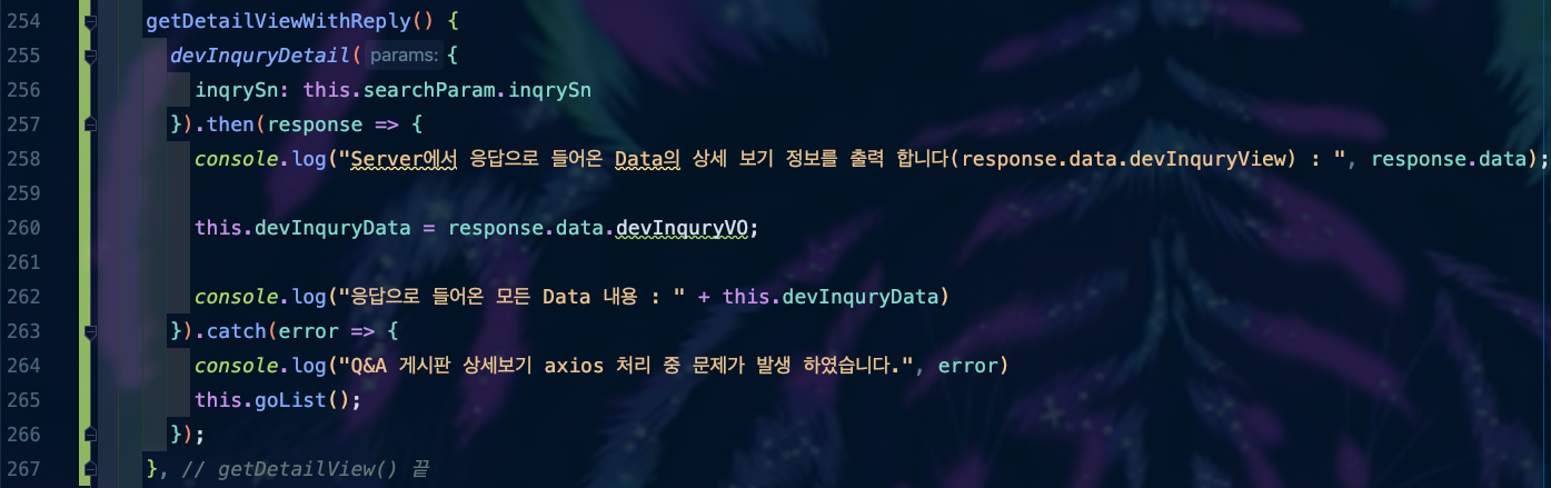 ๊ทธ๋ฐ ๋ค getDetailViewWithReply()๋ฅผ ํธ์ถํ๋๋ฐ, ํด๋น ๊ฒ์๊ธ ๋ฒํธ์ ํด๋น ํ๋ ์์ธ ์กฐํ Page๊ฐ ์ด๋ฆฌ๊ฒ ํ๊ธฐ ์ํด Back End๊ฐ ๋๋ ค์ค Data ์ค ๊ฒ์๊ธ ์ผ๋ จ๋ฒํธ(InqurySn)๊ฐ์ ์ ๋ฌํ์ฌ ์์ธ ์กฐํ Page๋ก ๋์๊ฐ ์ ์๊ฒ ํด๋น Method๋ฅผ ํธ์ถํ๋ ๊ฒ์ด์์.