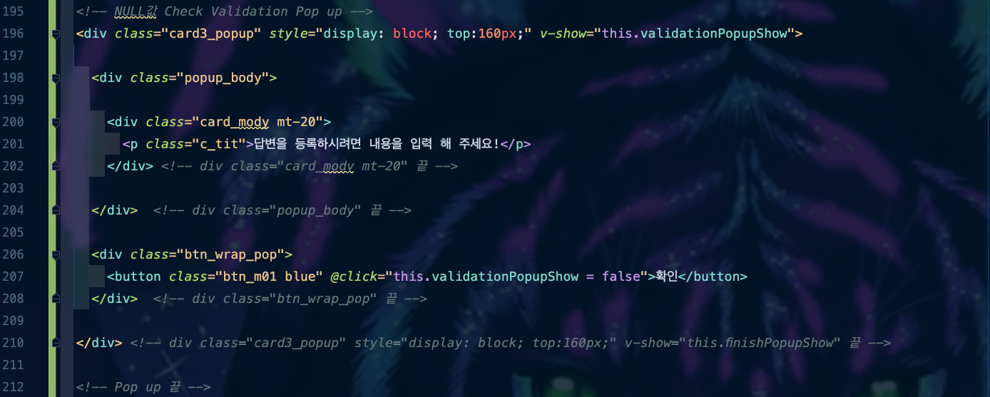114๋ฒ์งธ ์ค์ ๋ณด๋ฉด v-show๋ฅผ ํตํด validationPopupShow ๋ณ์๊ฐ true์ด๋ฉด ์๋ ๋ด์ฉ์ด ๋ณด์ฌ์ ธ๋ผ! ๋ผ๊ณ ๋ช ๋ น์ ์ค ๊ฒ์ด์์.