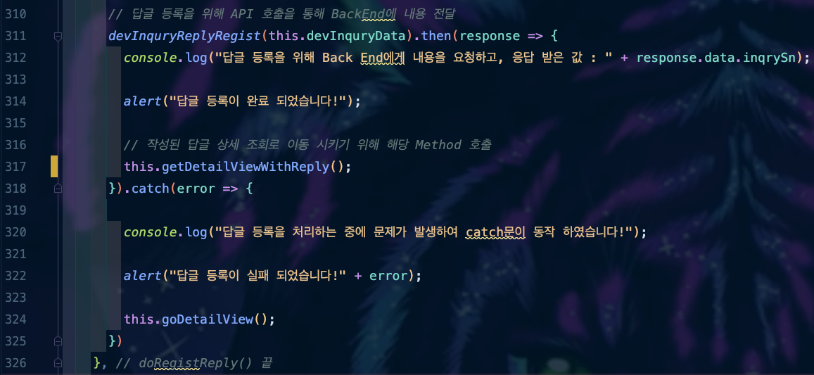 ์ ์์ ์ผ๋ก ๊ธ์ด ์์ฑ ๋์๋ค๋ฉด if๋ฌธ์ ๋ฐ์ด ๋๊ณ , ๋ฐ๋ก ์ด ๋ถ๋ถ์ผ๋ก ์ค๊ฒ ๋ ๊ฒ์ด์์. 311๋ฒ์งธ ์ค์ ๋ณด๋ฉด devInquryReplyRegist()๋ฅผ ํธ์ถํ๋๋ฐ, ์ด Method๋ Axios๋ฅผ ์ด์ฉํ๋ ๋ฐ๋ก ์์ฑ๋ Api.js์์ ์๋ ์น๊ตฌ๋ฅผ ํธ์ถํ๋ ๊ฒ์ด์์. ์ด ๋, devInquryData ๊ฐ์ฒด๋ฅผ ์ ๋ฌ์ ํด ์ค์ผ๋ก์จ, ๋ต๋ณ ๋ฑ๋ก์ ํ์ํ ๋ด์ฉ์ ๋ชจ๋ ๋ด์ ๋ณด๋ด๋ ๊ฒ์ด์์.
