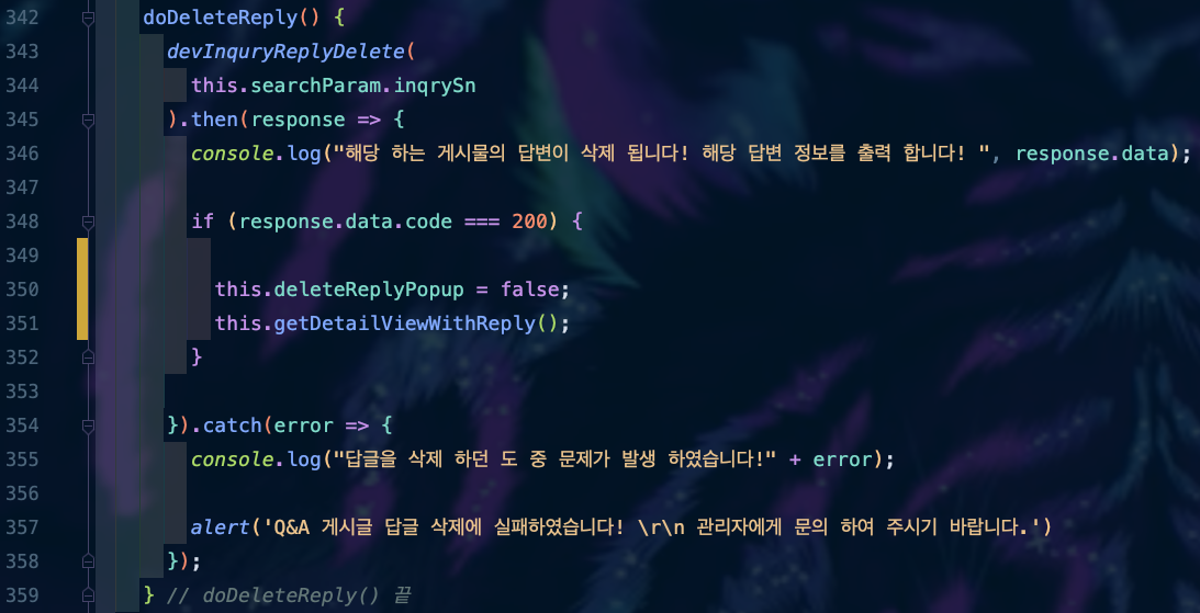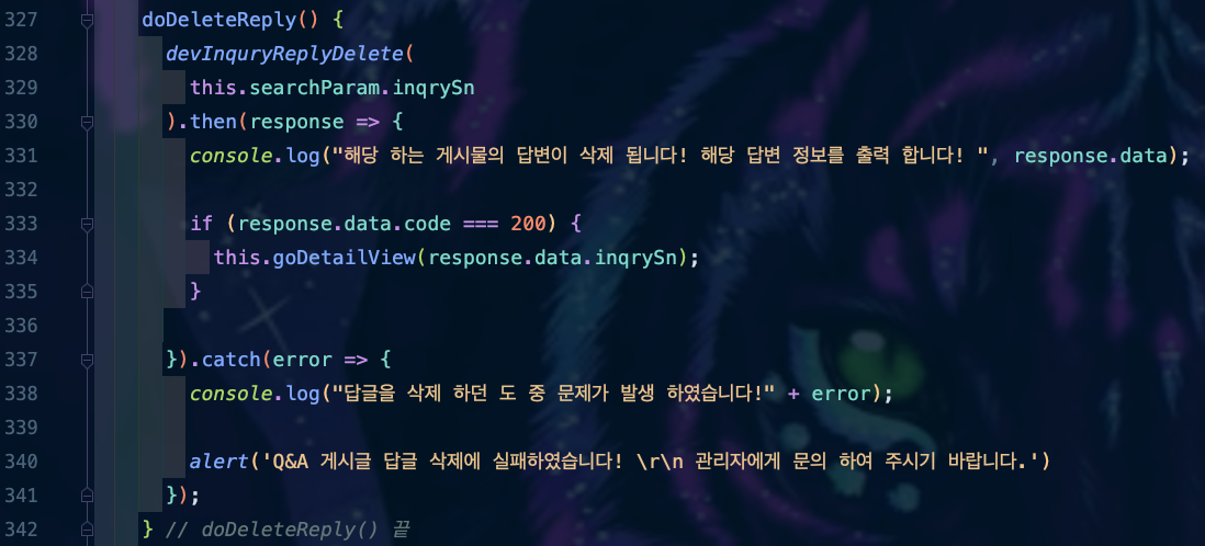 ๊ทธ๋ผ ์ด ๊ณณ์ ์์นํ `doDeleteReply`๊ฐ ๋์ํ๊ฒ ๋๋๋ฐ, ์ด ์น๊ตฌ๊ฐ ๋์ํ๋ฉด ์ต์ด devInquryReplyDelete๋ฅผ ํธ์ถํ๊ฒ ๋๋ ๊ฒ์ด์์. ์ด ๋, searchParam์์ ์๋ ๊ฒ์๊ธ ์ผ๋ จ๋ฒํธ(inqrySn)์ ์ ๋ฌํ๋ ๊ฒ์ด์์.