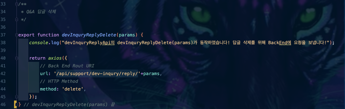 ์ด ์น๊ตฌ๊ฐ ๋์์ ํ๋ฉด ๋์์ ํ๊ณ , ์ด๋ค์ผ์ ํ๊ฒ ๋ค๊ณ Console์ ์ถ๋ ฅ์ ํด ์ค ๋ค API์ ๋ง๋ URI์ ๋ง์ถ์ด์ HTTP Method๋ `delete`๋ก ํ์ฌ params์ ๋งค๊ฐ ๋ณ์๋ก ์ ๋ฌ ๋ ๊ฒ์๊ธ ์ผ๋ จ๋ฒํธ(InqrySn)์ ์ ๋ฌํ๋๋ฐ, delete๋ Request Body์ ์ด๋ค ๊ฐ์ ์ ๋ฌํ์ง ์๊ณ , Back End์ Path Variable์ ๋ง์ถ์ด ๊ฐ์ URI์ ๋ณด๋ด๊ธฐ ์ํด data๊ฐ ์๋ params๋ฅผ ์ด์ฉํด์ ์์ฒญ์ ๋ณด๋ด๋ ๊ฒ์ด์์.
