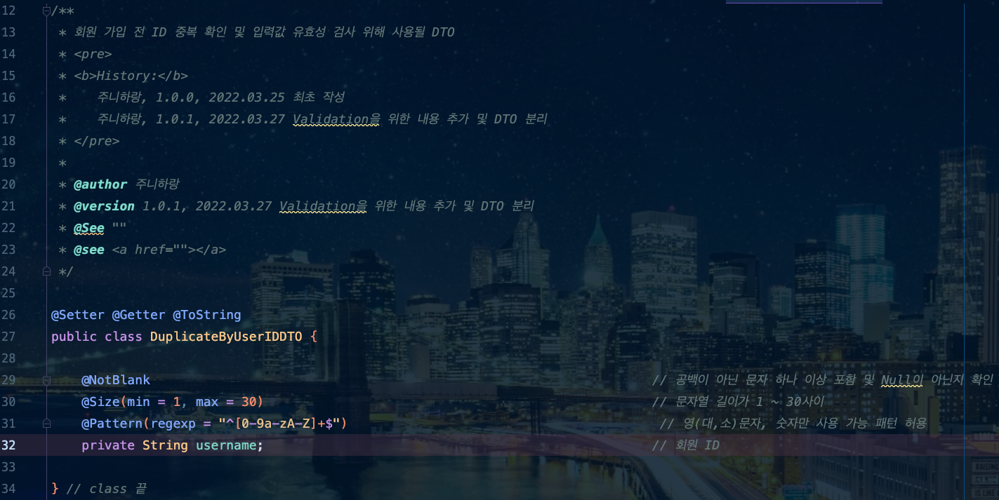 ๊ทธ๋ ๊ธฐ ๋๋ฌธ์ SQL์ `SELECT`๋ฅผ ํตํด username Column์ ๋งค๊ฐ ๋ณ์๋ก ์ ๋ฌ ๋ DTO์์ ์์ username์ด ์๋์ง ์ฐพ๋๋ก ํ๊ณ , ์ด๋ฅผ ๋ค์ `DuplicateByIdInfoDTO`์ ๋ด์ ๋ฐํํ๊ฒ ํ ๊ฒ์ด์์.