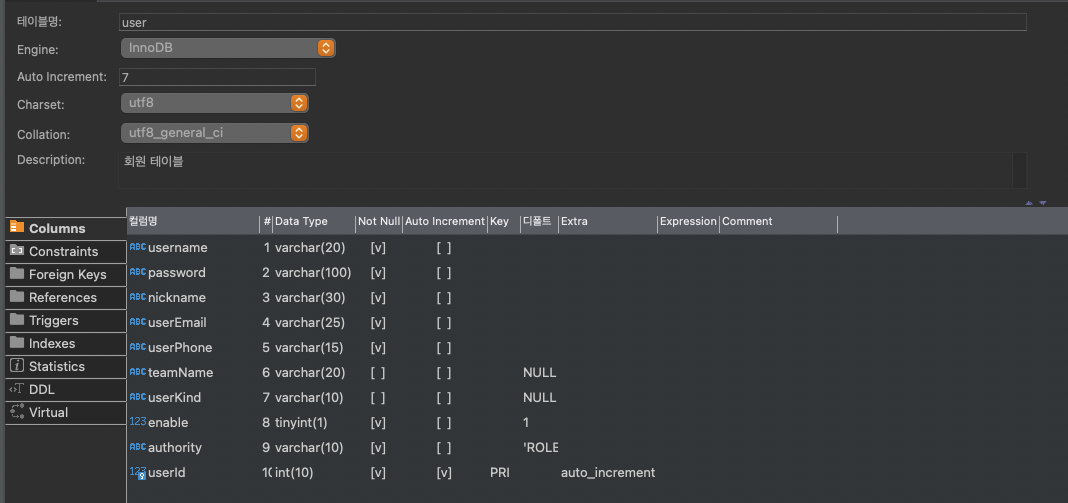 ๊ทธ๋ ๊ธฐ ๋๋ฌธ์ SQL์ `INSERT`๋ฅผ ํตํด ํ์ ๊ฐ์ ์ ์๋ํ๋ ์ด์ฉ์๊ฐ ๋ณด๋ธ ๊ฐ์ ๊ฐ Column์ ์ ๋ ฅํ์ฌ ์ ์ฅ ๋๊ฒ ํ๊ณ , ํด๋น ๊ณ์ ์ด ํ์ฑํ ๋์ด ์๋ค๊ณ ํ์ํ๊ธฐ ์ํด `enable` Column์ `1` ๊ฐ์ ๋ฃ์ด์ฃผ๊ณ , ํด๋น ์ด์ฉ์์ ๊ธฐ๋ณธ ๊ถํ์ `ROLE_USER`๋ก ๋ฃ์ด์ค ๊ฒ์ด์์.