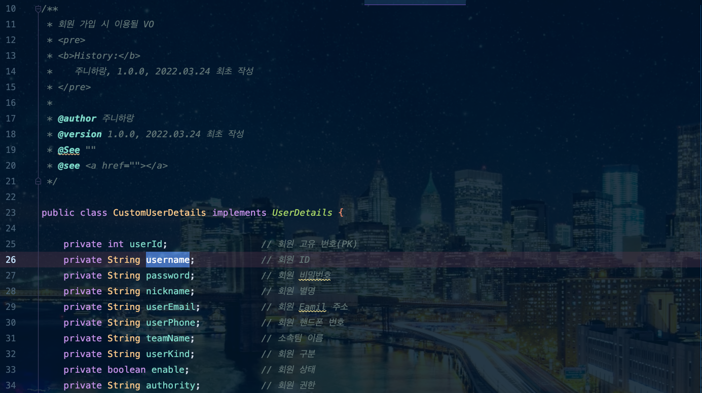 ์ฃผ๋ํ๋์ ํ์๊ฐ์ ๋ฐ Login ์ ์ด์ฉ๋ Value Object ๊ฐ์ฒด๋ฅผ `UserDetails`๋ฅผ ๊ตฌํํ Class๋ฅผ ๋ง๋ค์ด์ ๊ตฌํํ ๊ฒ์ด์์.