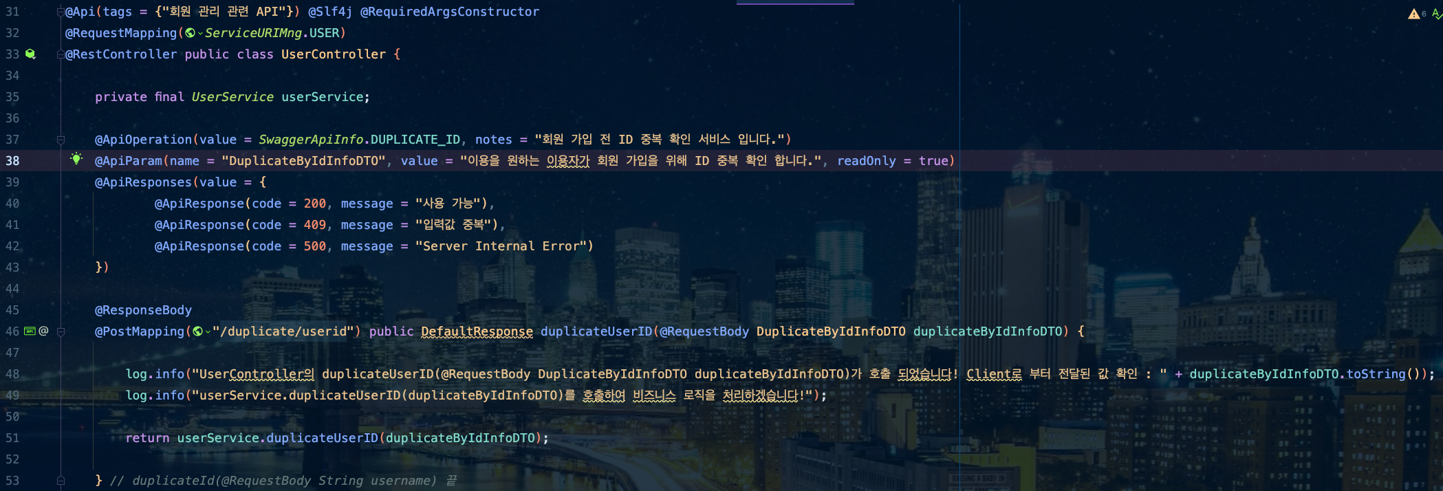 ๊ทธ๋ฐ ๋ค 47๋ฒ์งธ ์ค์ if๋ฌธ์ ํตํด ํด๋น ๋ณ์์ ๊ฐ์ด ๋น์ด ์๋ค๋ฉด ์ค๋ณต๋๋ ID๊ฐ ์๋ค๋ ๊ฒ์ด๊ธฐ ๋๋ฌธ์ ๋ฐํ ํ ๋, HTTP Status Code 200๊ณผ ํจ๊ป ์๋ต Message๋ก ํ๊ธ์ `์ฌ์ฉ ๊ฐ๋ฅ`๊ณผ ์์ด๋ก๋ `OK`๋ฅผ ๋ฐํํ๊ณ , ํด๋น ๊ฒ์ ๊ฒฐ๊ณผ๋ฅผ ๋ฐํํ๊ธฐ ์ํด ๊ฐ์ฒด๋ฅผ ์ถ๊ฐ๋ก ๋ฐํ ํด ์ฃผ๋ ๊ฒ์ด์์.