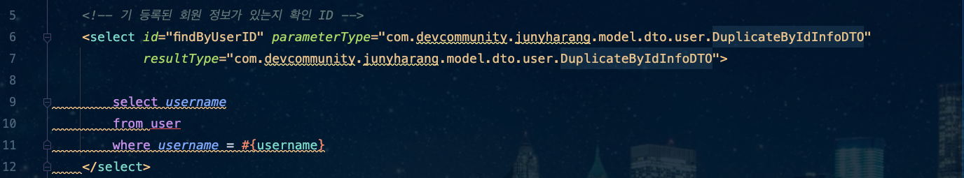 <select id="findByUserID" parameterType="com.devcommunity.junyharang.model.dto.user.DuplicateByIdInfoDTO"