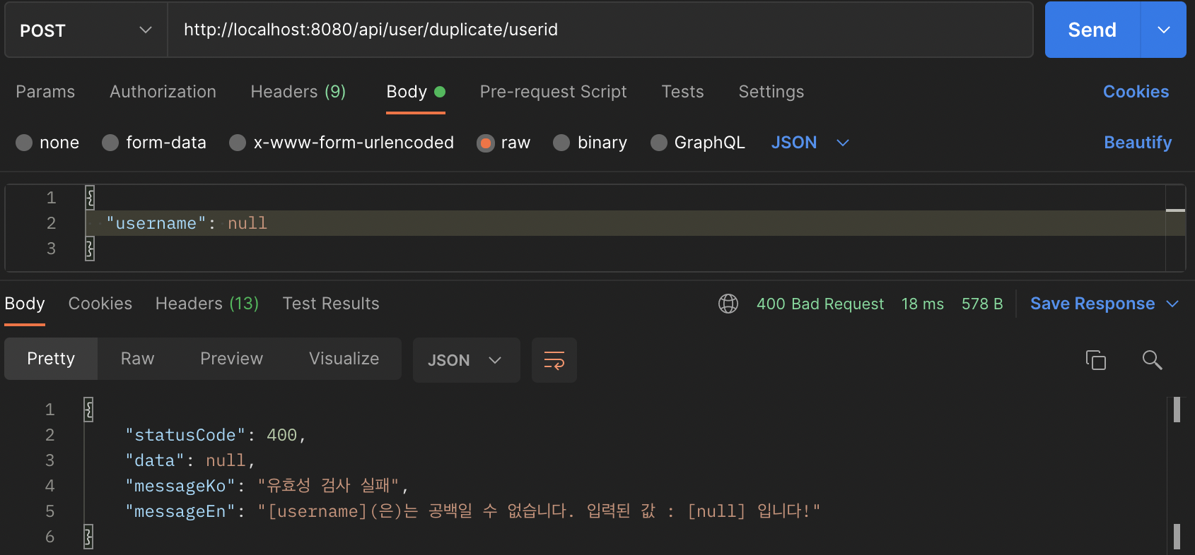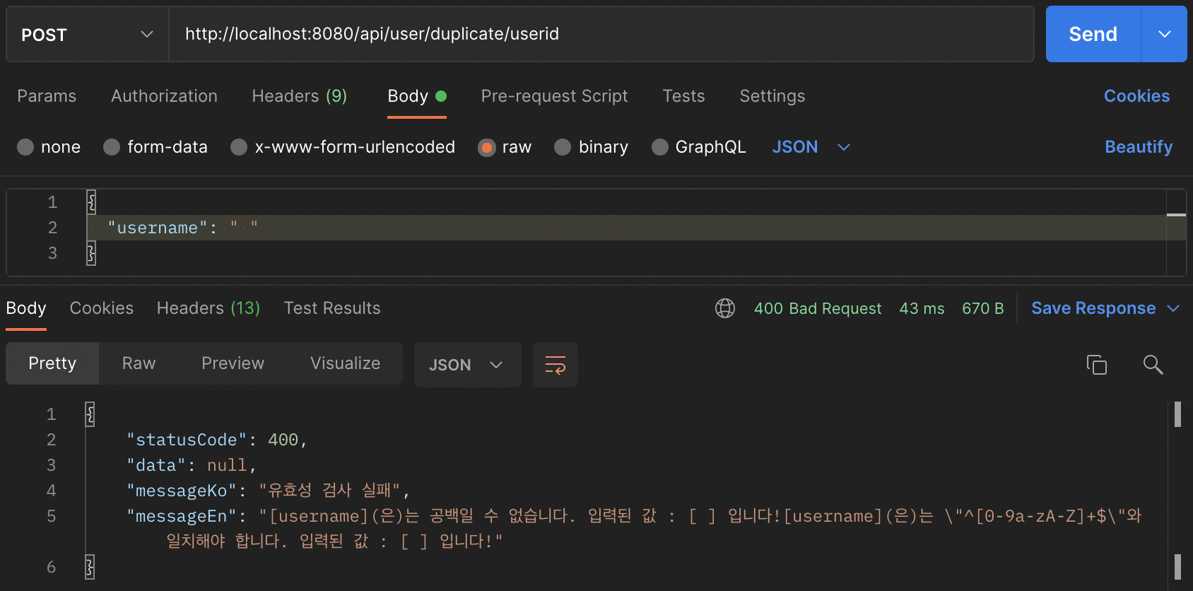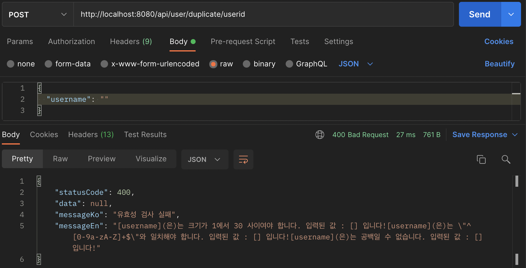 โ [Spring] @Valid๋ฅผ ์ด์ฉํ @RequestBody ๊ฒ์ฆ / Exception Handling / ์ ๊ท ํํ์