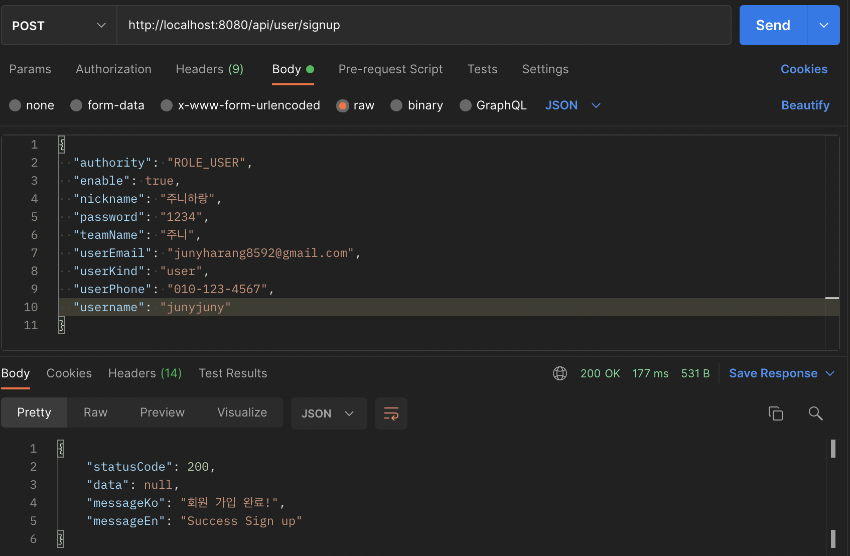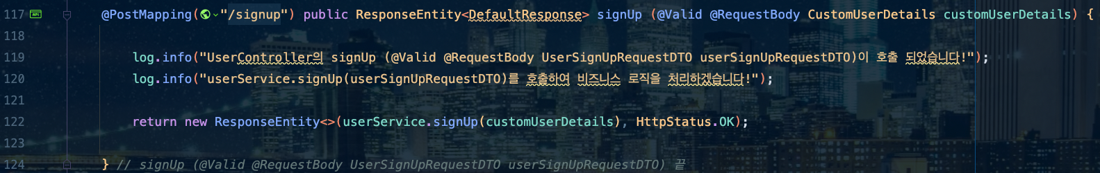 ๊ทธ๋ฐ ๋ค Controller์๊ฒ ๋ฐํํ ๋, HTTP Status Code 200 ์ซ์์ ํจ๊ป, ํ๊ธ Message ํ์ ๊ฐ์ ์๋ฃ!์ ์์ด Success Sign up์ ์ ๋ฌ ํด ์ฃผ๋ ๊ฒ์ด์์.