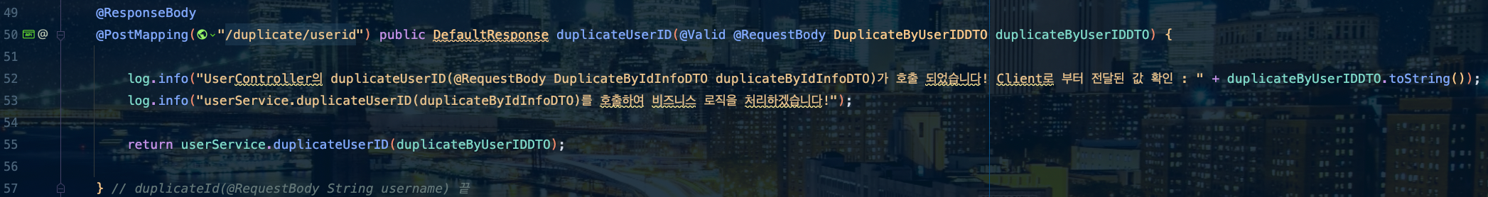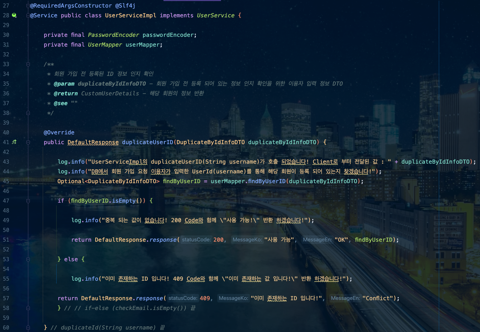 ์ต์ด ์ด Method๊ฐ ํธ์ถ๋๋ฉด `Mapper`์ ํด๋น Method๋ฅผ ํตํด `DuplicateByIdInfoDTO`๋ฅผ ์ ๋ฌํด์ ํธ์ถํ๋๋ฐ, ์ด ๋ ์ด์ฉ์๊ฐ ID ์ค๋ณต ํ์ธ ๋ฒํผ์ ๋๋ฅด๊ฒ ๋๋ฉด ํด๋น ID๋ฅผ DB์ Selectํ๊ฒ ๋๊ณ , ๊ทธ ๊ฒฐ๊ณผ ๊ฐ์ `Optional`๋ก `NPE(Null Point Exception)` ๋ฐฉ์ง๋ฅผ ํตํด `DuplicateByIdInfoDTO` ๊ฐ์ฒด ์๋ฃํ Type์ ๋ณ์ `findByuserID`์ ๋ด์ ์ฃผ๋ ๊ฒ์ด์์.