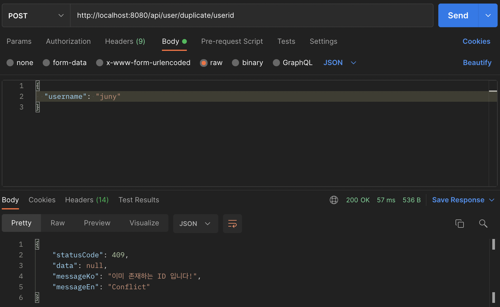 ๋ง์ฝ ๊ฒ์ ๊ฒฐ๊ณผ๊ฐ ์๋ค๋ฉด ํด๋น ID๋ ์กด์ฌํ๋ค๋ ์๋ฏธ๊ฐ ๋๊ณ , ๋ฐํ ํ ๋, HTTP Status Code๋ฅผ 409์ ํจ๊ป ์๋ต Message๋ก ํ๊ธ์ `์ด๋ฏธ ์กด์ฌํ๋ ID ์ ๋๋ค!`์ ์์ด๋ก `Confilct`๋ฅผ ๋ฐํ ํด ์ฃผ๋ ๊ฒ์ด์์.