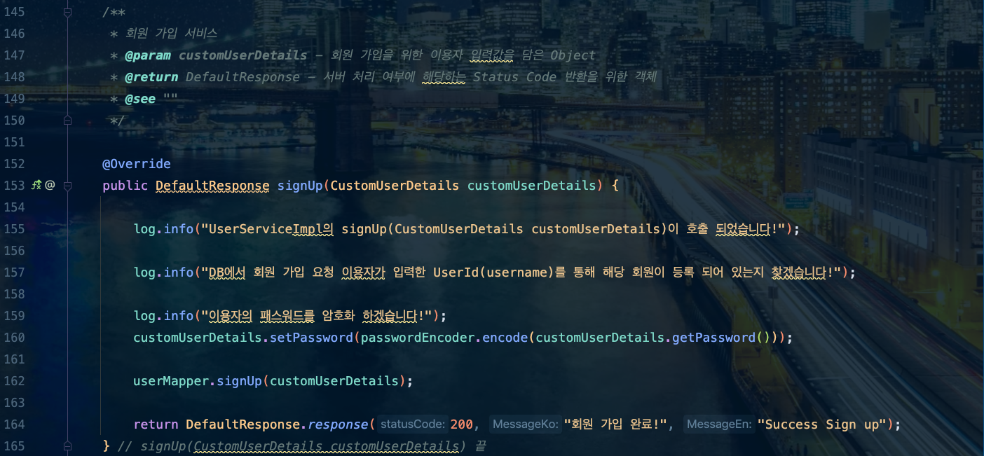 ๊ทธ๋ฐ ๋ค์ ํ์ ๊ฐ์ ์ ํ ๋, ์ด์ฉ์์ ๋น๋ฐ๋ฒํธ๋ฅผ ์ํธํ ํ๊ธฐ ์ํด `PasswordEncoder` ๊ฐ์ฒด๋ฅผ ์ ์ธํ๊ณ , DB๋ฅผ ์ด์ฉํ๊ธฐ ์ํด `UserMapper `๊ฐ์ฒด๋ฅผ ์ ์ธํ ๊ฒ์ด์์. ์ด ์น๊ตฌ๋ค์ final๋ก ์ ์๋์ด ์๊ณ , ์ด ๋๋ฌธ์ `@RequiredArgsConstructor`๋ฅผ ์ ์ธํ์ฌ ์์ฑ์๋ฅผ ์ด์ฉํ ์ ์๋๋ก ํด ์ค ๊ฒ์ด์์.