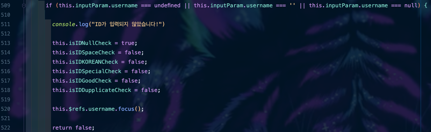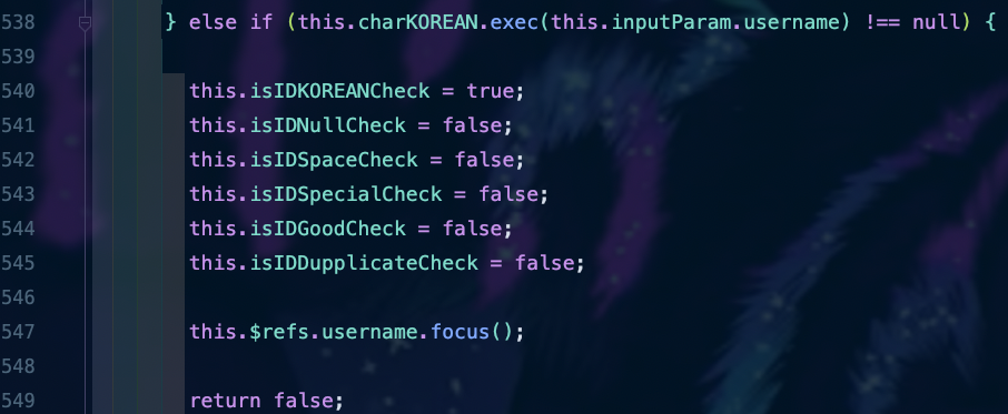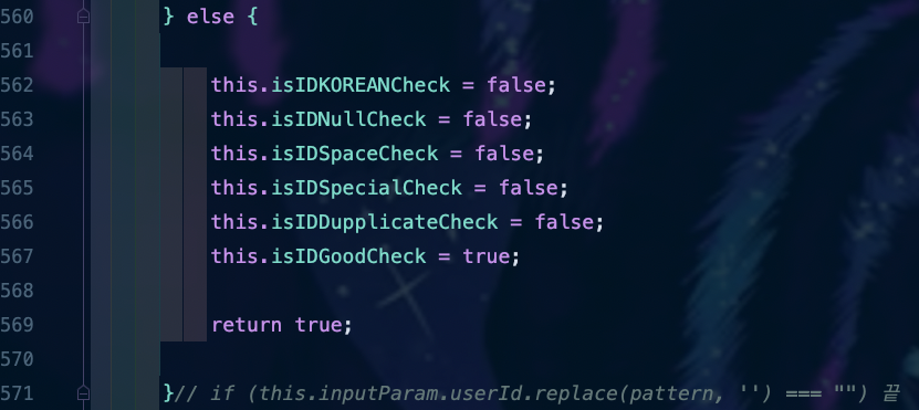 ๊ทธ ๋ค์ 500๋ฒ์งธ ์ค์ `isIDGoodCheck`๋ฅผ `true`๋ก ๋ณ๊ฒฝํ๋๋ฐ, ์ด๊ฑธ `true`๋ก ๋ณ๊ฒฝํ์ง ์์ผ๋ฉด