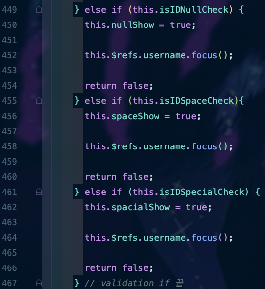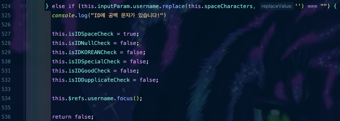 if๋ฌธ์ ๋ค์ด์ค๊ฒ ๋๋ฉด isIDKOREANCheck(ID์ ํ๊ธ์ด ์ ๋ ฅ ๋์๋์ง ํ์ธํ๋ ๋ณ์) ๋ณ์๋ฅผ `true`๋ก ๋ฐ๊พธ๊ณ , 547๋ฒ์งธ ์ค์ ์๊ฑฐํด์ ID ์ ๋ ฅ๋์ด ํ์๊ฐ ๋๋ฉด์ ๋ค๋ฅธ ๊ณณ์ ์ ๋ ฅ์ด ๋์ง ์๊ฒ ํด ์ฃผ๋ ๊ฒ์ด์์.