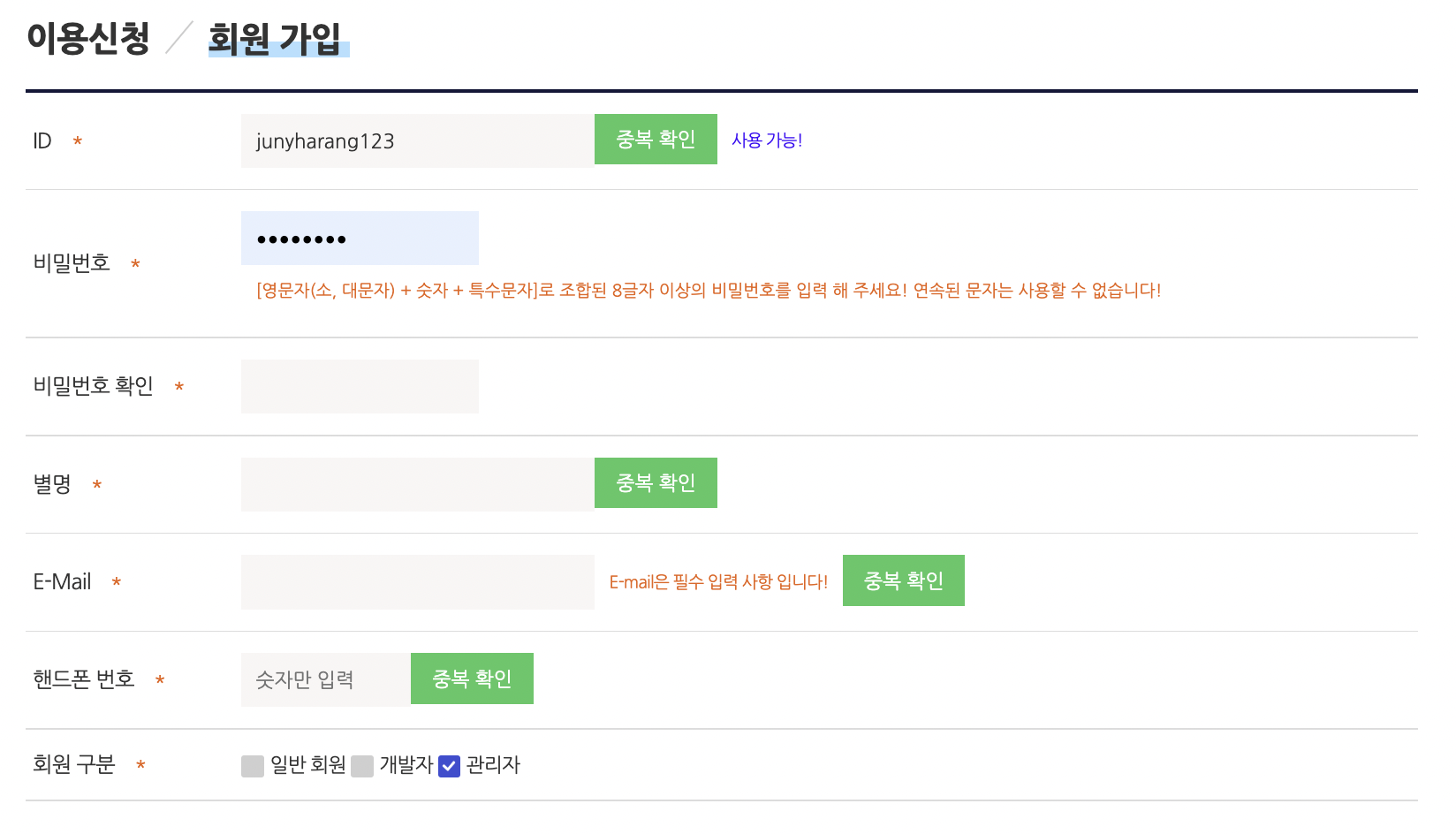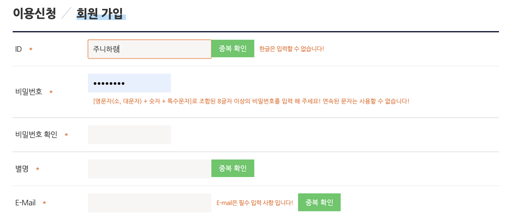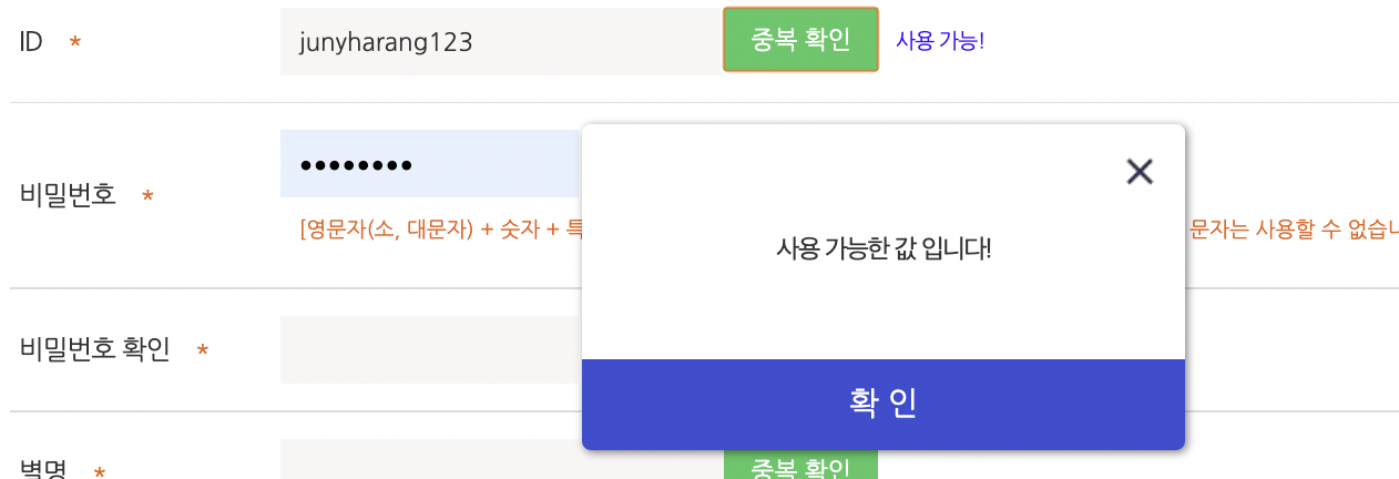 ์ด๋ ๊ฒ ํด ์ฃผ๋ ์ด์ ๋ ์ด์ฉ์๊ฐ ๋ชจ๋ ์ ๋ ฅ๊ฐ์ ์ ๋ ฅํ๊ณ , ์ค๋ณต ์ฒดํฌ๋ฅผ ๊ฐ๊ฐ ํด์ผ ํ๋ ํญ๋ชฉ๋ค์ด ์๋๋ฐ, ์ค๋ณต ์ฒดํฌ๋ฅผ ์ํ๊ณ , ํ์ ๊ฐ์ Button์ ๋๋ฅด๊ฒ ๋๋ฉด ์ค๋ณต ์ฒดํฌ๋ฅผ ํ๋ผ๊ณ ์ ๋ํ๊ธฐ ์ํด ์์ฑ ํด ์ค ๊ฒ์ด์์.