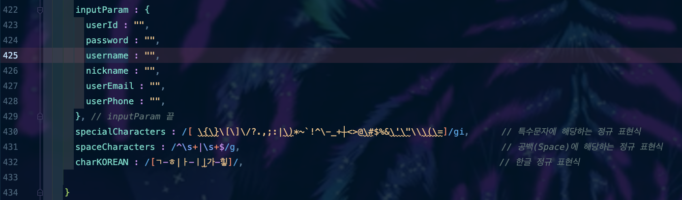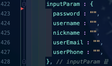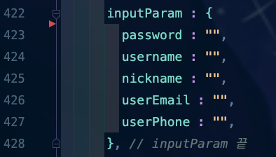 `inputParam`๊ฐ์ฒด ์์๋ ์ด์ฉ์๊ฐ ์ ๋ ฅํ์ ID, ๋น๋ฐ๋ฒํธ, ๋ณ๋ช , E-mail์ฃผ์, ํธ๋ํฐ ๋ฒํธ๊ฐ ๋ค์ด ์๊ฒ ๋๋ ๊ฒ์ด์์.