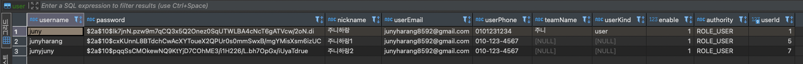ํ์ฌ `Data Base`์๋ ์ด๋ ๊ฒ 3๊ฐ์ ์ด์ฉ์ ์ ๋ณด๊ฐ ์ ์ฅ ๋์ด ์๋๋ฐ, Test๋ฅผ ์ํด `junyharang`์ผ๋ก `ID ์ค๋ณต ํ์ธ` ์ ํด ๋ณด๋๋ก ํ ๊ฒ์ด์์.