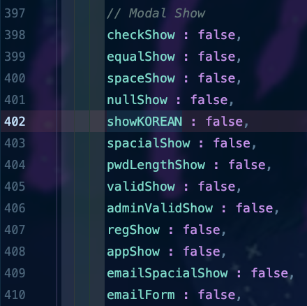 228๋ฒ์งธ ์ค์ `v-show`์ ๋ณ์์ธ `showKOREAN`์ด `true` ๊ฐ์ด ๋๋ฉด ์ด `Modal` ์ฐฝ์ `v-show`๋ก ์ธํด ๋ณด์ด๊ฒ ๋๋ ๊ฒ์ด์์.